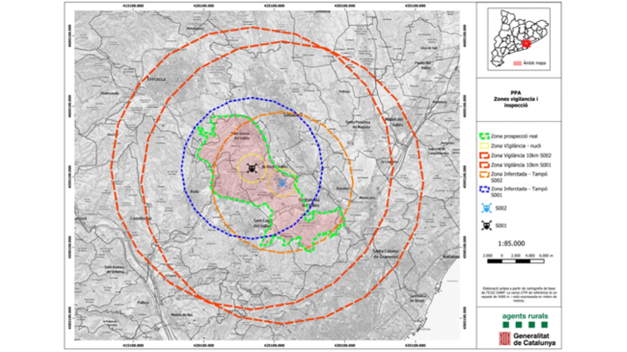 Així doncs, en aquests 12 municipis s’ha decretat el tancament total d’accés al medi natural; la suspensió de qualsevol activitat de caça i treballs forestals; la prohibició de qualsevol activitat en zona rústica per motius de bioseguretat; la istal·lació de barreres físiques i químiques, així com trampes per al control de senglars; i l’activació d’operatius conjunts amb CAR, Mossos d’Esquadra, SEPRONA i tècnics del Departament. Per la seva banda, l’Ajuntament de Terrassa ha tancat els accessos al medi natural davant l’activació del Pla de Contingència i demana “prudència i col·laboració a la ciutadania” per garantir “l’eficàcia de les mesures adoptades”.