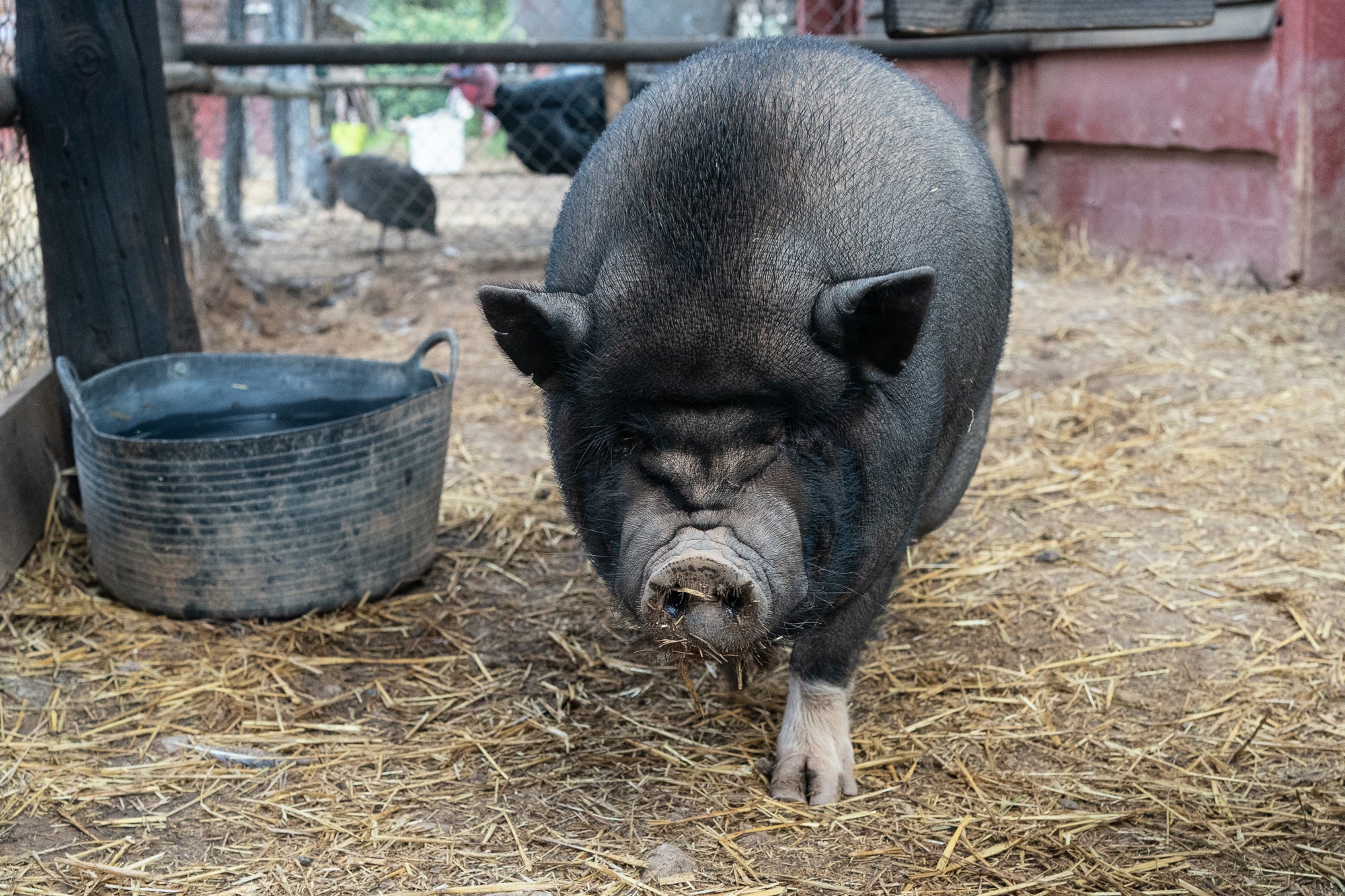 La Pipi i la seva filla estan al seu propi recinte, amb una zona on refrescar-se i un altre per estar a l’ombra. Els porcs no suen i necessiten aquests espais per refrigerar-se. Els ases i un poni pasturen al seu aire. Els dos ases venen de pagesia. Un d’ells, el Gastón, està d’ençà que van obrir. El poni ve d’una casa privada.