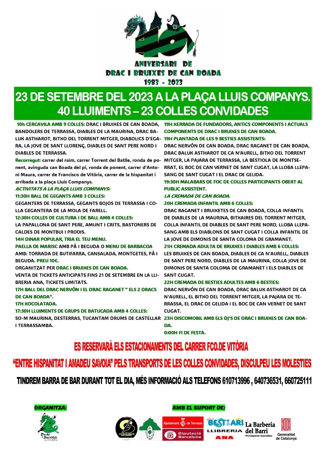 Gran festa d’anivesari per celebrar els 40 anys de Dracs i Bruixes de Can Boada. La xifra no és pas menor i per això l’entitat ha decidit que calia fer una commemoració que n’estigués a l’alçada. La data escollida ha estat aquest dissabte dia 23 de setembre i el lloc, la plaça Lluís Companys. Hi haurà 40 lluïments i un total de 23 colles convidades, un esdeveniments d’aquells que faran època.