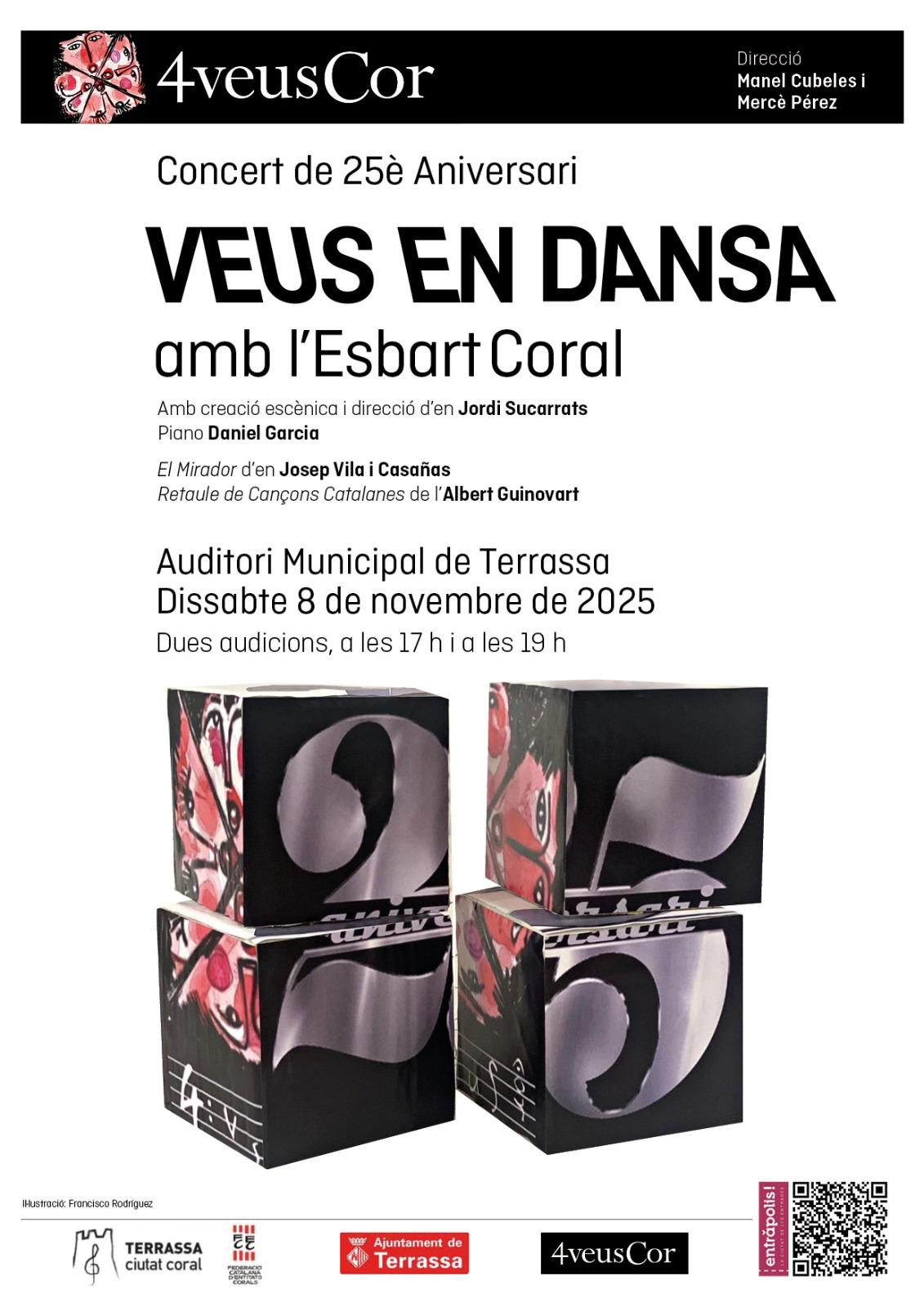 La coral 4VeusCor tancarà aquest dissabte, 8 de novembre, els actes de celebració dels seus 25 anys amb dos concerts (a les 17:00 i a les 19:00 hores) a l’Auditori de Terrassa. Sota el títol ‘Veus en dansa’, la coral interpretarà el ‘Retaule de cançons catalanes‘ d’Albert Guinovart i ‘El Mirador’ de Josep Vila, acompanyats per l’Esbart Coral i dirigits per Manel Cubeles i Mercè Pérez.