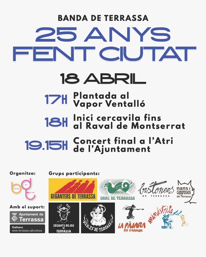 La Banda de Terrassa commemora aquests 2026 el seu 25è aniversari. Per fer-ho, l’entitat ha organitzat una gran festa sota el nom ’25 anys Fent Ciutat’ i que tindrà lloc el pròxim dissabte, 18 d’abril, pels carrers del centre de la ciutat. Des de l’agrupació musical terrassenca destaquen que es tracta d’una proposta festiva i oberta a tota la ciutadania que combinarà música en directe i cultura popular.