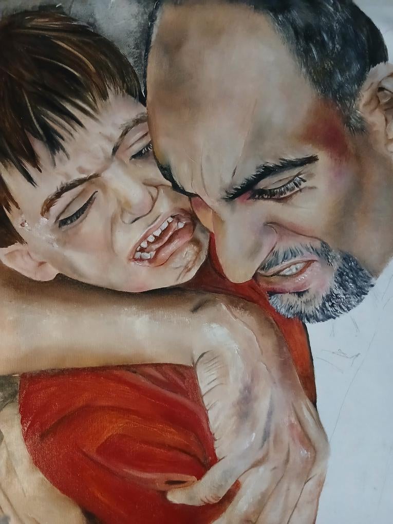 Per esgotament psicològic. Totes les notícies que arribaven, totes aquestes imatges. Vaig tenir un bloqueig mental i una impotència molt gran. I l’única manera que conec que puc sanar és pintant. Una nena plorant, una que demana aliments, una mare que enterra el seu fill, el retrobament d’un pare amb el seu nen, un infant abraçant la seva mare, un nen ferit i plorant, una persona gran desesperada… I entremig dels retrats, una mica de context amb els edificis enderrocats, amb un color gris i de sang. No puc pintar tots els conflictes del món, és materialment impossible, vaig agafar aquest perquè em va colpir molt fort, i perquè no és una guerra, és una matança i tota aquesta gent és allà, indefensa, sense aliments ni medicació.