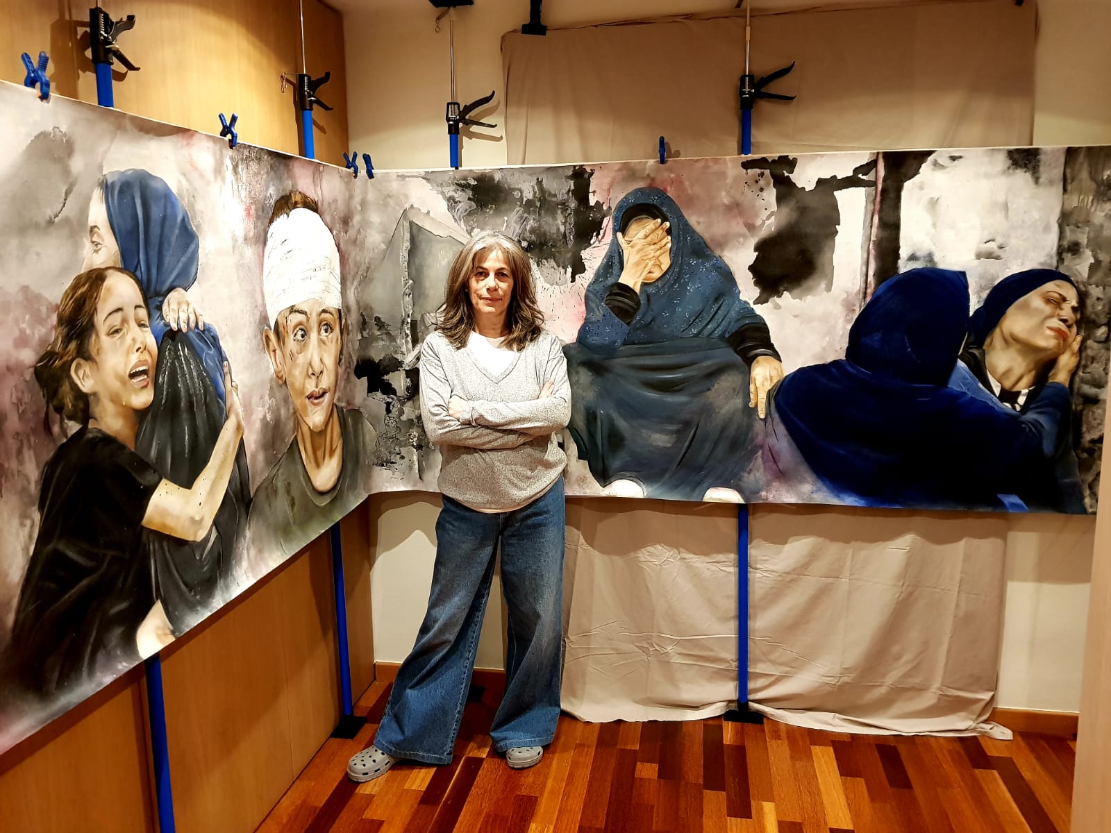 Doncs a l’entrada de l’ONU seria perfecte, no? (riu). Mai se sap. La veritat és que jo ho vaig fer perquè havia de treure tota aquesta impotència, i quan tinc aquest sentiment el que faig és canalitzar-ho a través de la pintura. Només vaig pensar que havia de treure tota aquesta angoixa que m’estava fent mal. I és el que vaig fer, no vaig pensar en cap moment on havia d’exhibir-se. O sigui, està a disposició del qui m’ho demani per denunciar aquest genocidi a través de l’art. Això és el que jo faig.