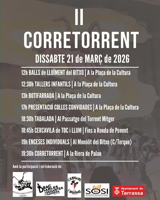 La jornada s’iniciarà a les dotze del migdia amb una trobada a la plaça de la Cultura on hi haurà balls de lluïment de la colla terrassenca. El matí transcorrerà entre tallers per a la canalla i una botifarrada popular. A la tarda, a partir de les cinc (17h) tindrà lloc la presentació de les colles convidades i de l’esperat Corretorrent. A les 18h, totes les colles i persones participants es desplaçaran fins al Passatge del Torrent Mitger.