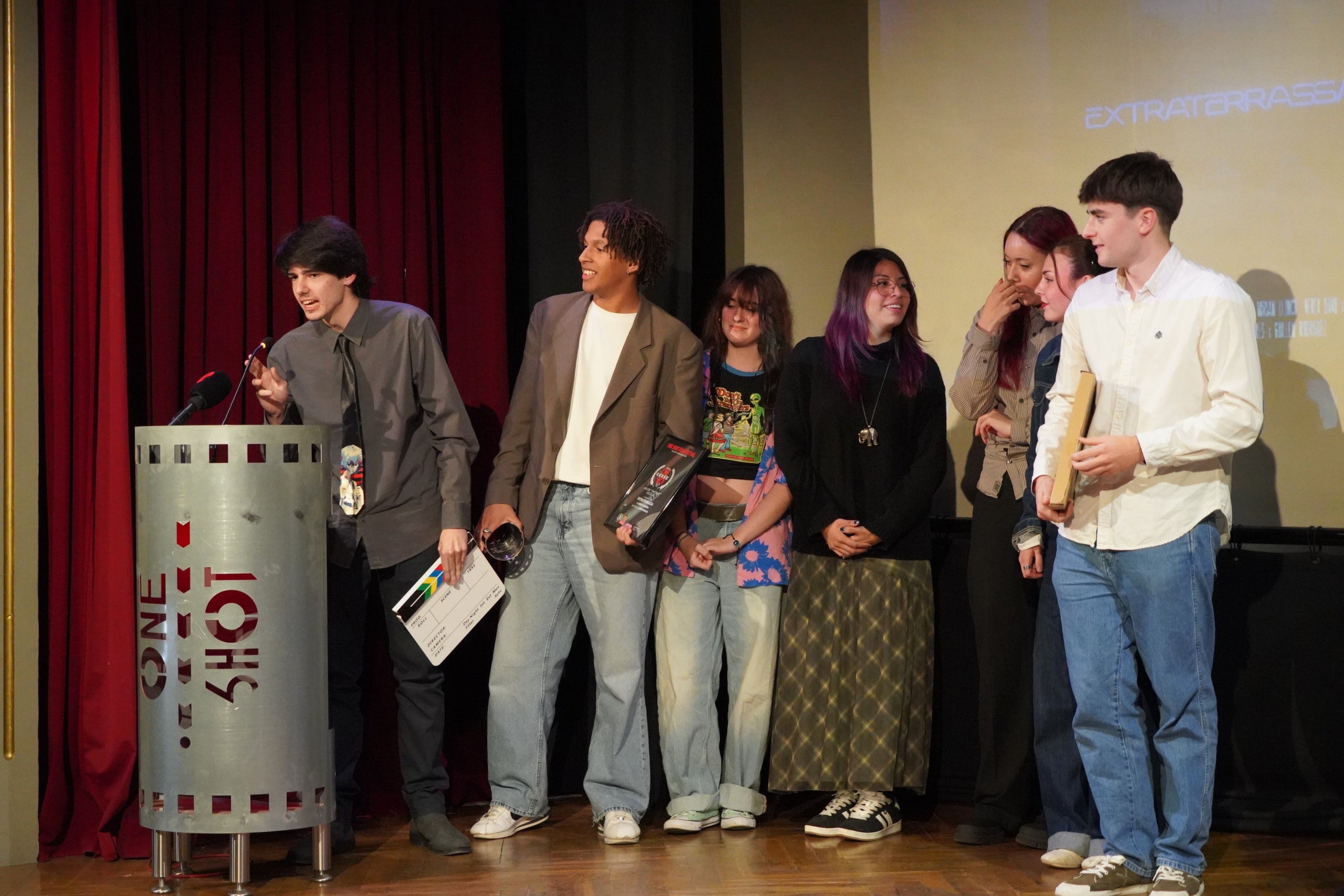 PRIMER ONE SHOT JUNIOR 2025. “Si el amor aprieta” de Yueling yu, Daniela Roldán, Marcos A. Díaz i Darwin J. Ruiz, de l’Institut Grupo Cántico de Córdoba. Una producció d’Espanya. Entrega el premi Marta Anyé, membre del Jurat. A part del diploma, s’emporten de premi un trofeu One shot i una claqueta professional.