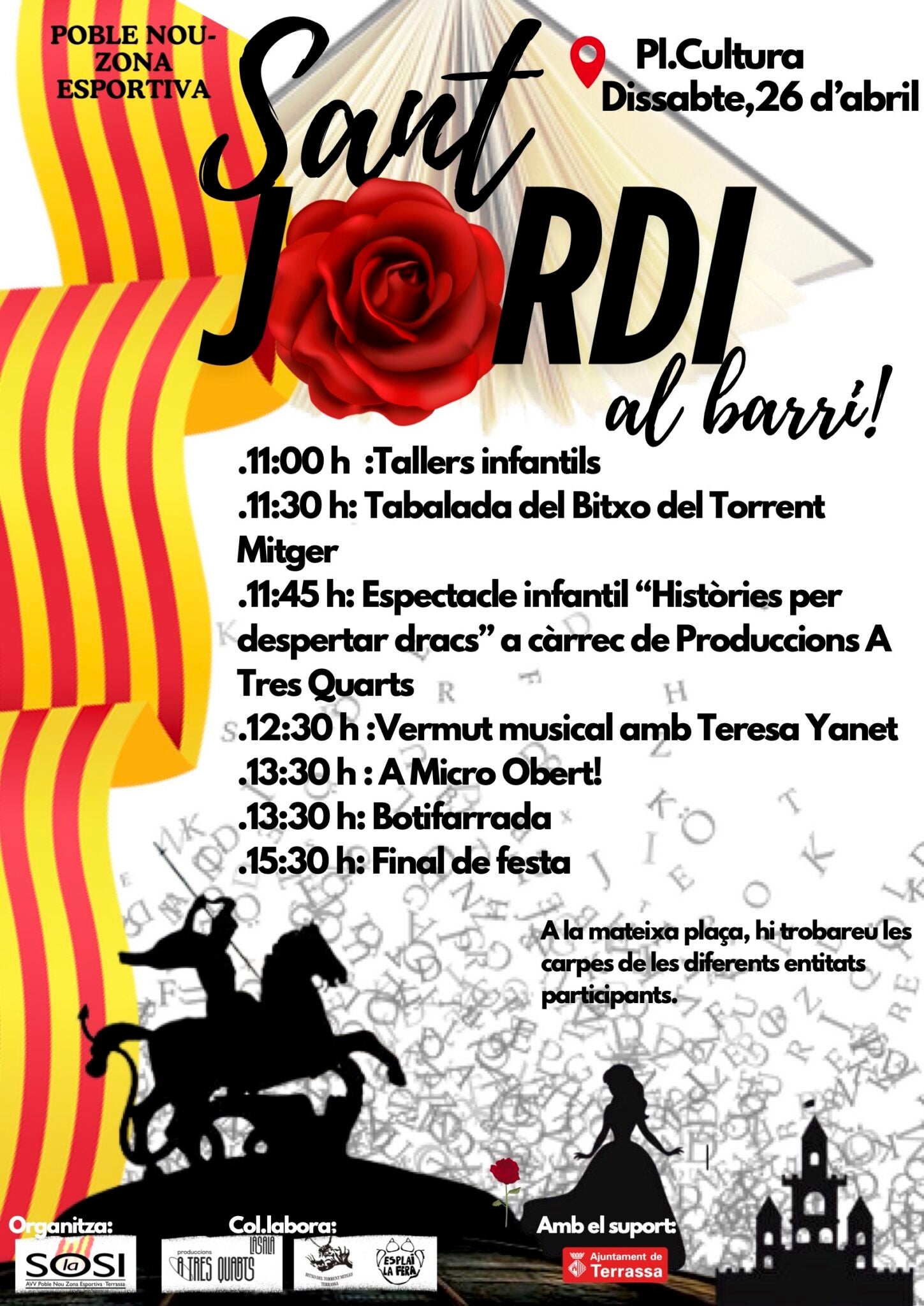 La celebració de Sant Jordi al barri és una activitat organitzada per la Comissió de Cultura de l’Associació Veïnal de Poble Nou Zona Esportiva, però compta amb la col·laboració de l’Esplai La Fera, el Bitxo del Torrent Mitger, Produccions a Tres Quarts i La Sala, i el suport de l’Ajuntament de Terrassa.