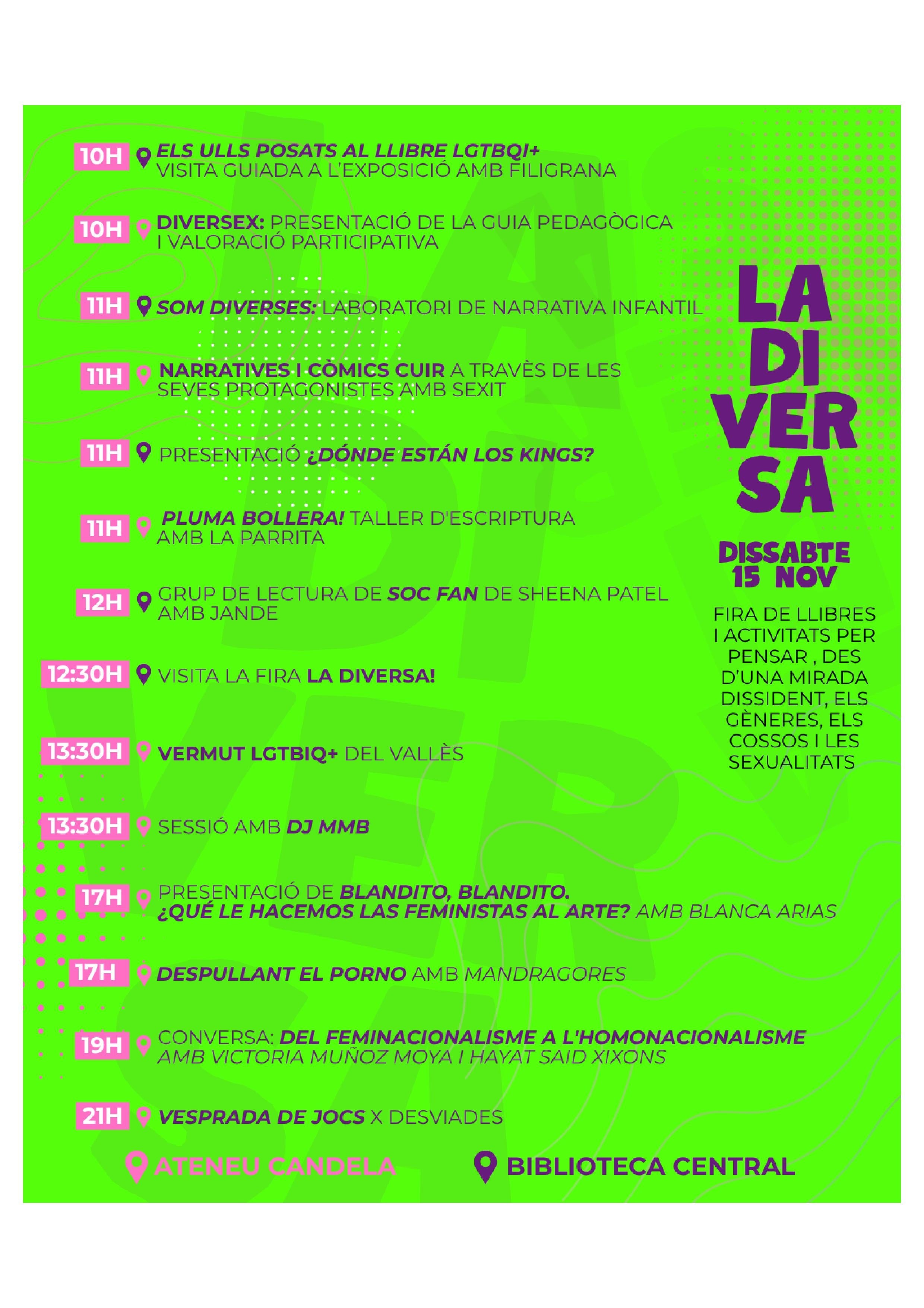 Per altra banda, a la Biblioteca Central de Terrassa també s’hi celebraran algunes activitats com presentacions i tallers, de 10:00 a 13:30 hores, i una continuació de l’exposició ‘Amb els ulls posats al llibre LGTBIQ+’. ‘La Diversa’ es completarà amb tallers, grups de lectura, converses, presentacions, sessions de DJ i espais d’exposició diversos que podreu trobar durant tot el dia en aquests dos espais de la ciutat.
