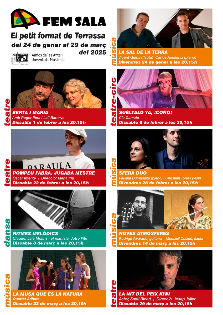 El cicle presenta espectacles professionals de petit format amb la finalitat de diversificar l’oferta cultural de Terrassa. A partir d’aquest 24 de gener i fins al mes de març podrem veure produccions escèniques que inclouen teatre, música, pintura, dansa, poesia, circ… alternant projectes propis i externs. A més, com a novetat, Amics inicia una sèrie de concerts de música clàssica els divendres, que esperen que pugui tenir continuïtat els propers anys. Com sempre es poden trobar les entrades a Entrapolis.com i informació sobre els espectacles a la pàgina del Fem Sala (amb el codi FEMSALAPRO2025 es pot obtenir un 15% de descompte).