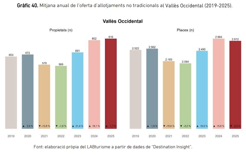 Segons l’informe Anàlisi dels allotjaments no tradicionals a la Regió de Barcelona, elaborat pel Laboratori de Turisme de la Diputació de Barcelona (LABturisme), el Barcelonès (excepte la ciutat de Barcelona) amb un +37,3 %, i el Vallès Occidental amb un +22,8 % són les comarques que han experimentat els increments més importants entre 2019 i 2024. En canvi, el Berguedà (-34,1 %), Osona (-30,1 %), Anoia (-22,4 %) i Garraf (-21,7 %) són les comarques que han reduït més el nombre de propietats aquests últims cinc anys.