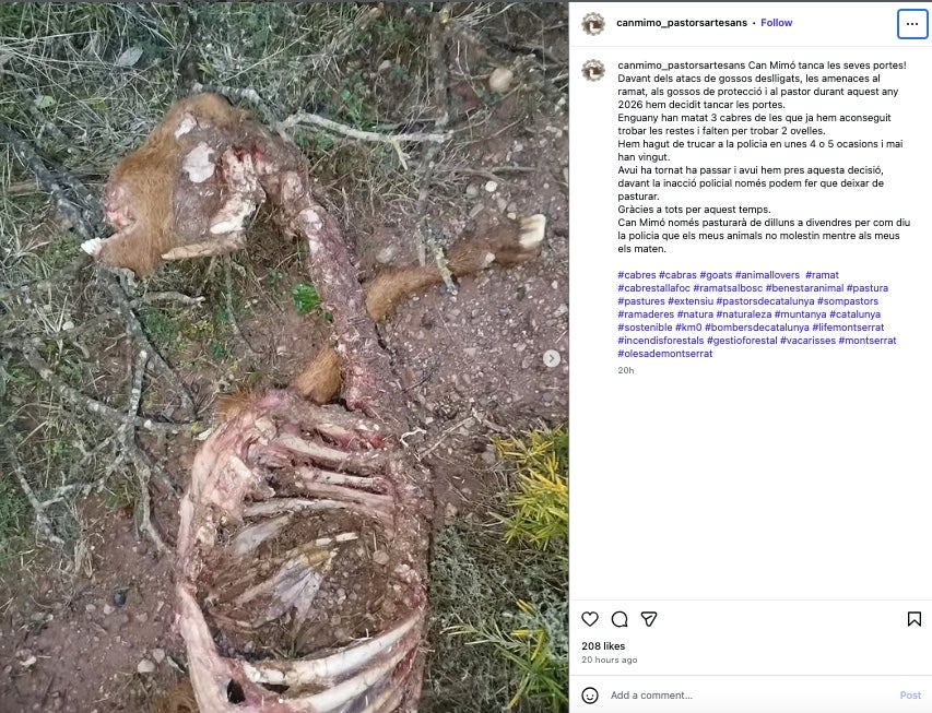 I és que aquest diumenge, dia 25 de gener, “ha tornat a passar”. És a dir, el ramat de cabres i ovelles de Can Mimó s’ha vist atacat brutalment per un gos que anava deslligat. El recompte d’aquest 2026 és ja tràgic: han matat 3 cabres, de les quals s’han pogut recuperar les restes, i encara es busquen dues ovelles, que han desaparegut. Per això, “hem pres aquesta decisió”, que consideren que s’ha vist anticipada “davant la inacció policial”. Per tant, l’única opció que veuen viable “és deixar de pasturar”. Les queixes cap al cos de seguretat venen motivades perquè “hem hagut de trucar a la policia en unes 4 o 5 ocasions, i mai han vingut”.