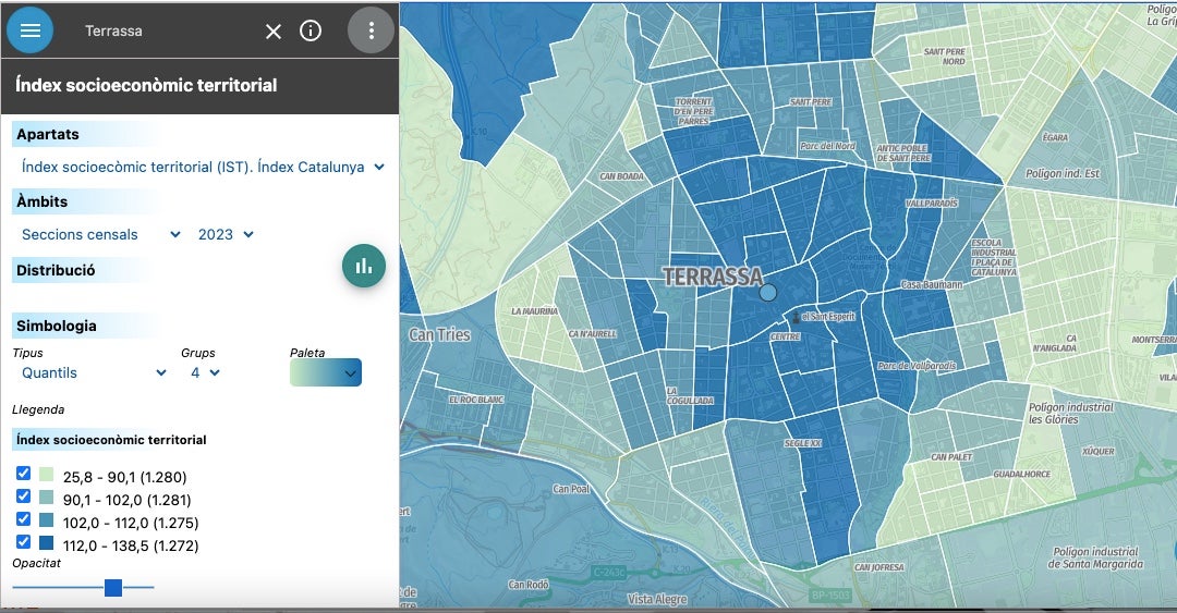 L’aplicació creada per l’Idescat permet entrar amb més detall i acostar-nos a l’IST per districtes censals. D’aquesta manera, podem entendre quins són els barris de Terrassa que tenen un valor més baix i quins un valor més alt. Recordem que l’Índex no només té en compte el nivell de renda familiar, sinó també el nivell d’estudis o el percentatge de desocupació entre el veïnat.