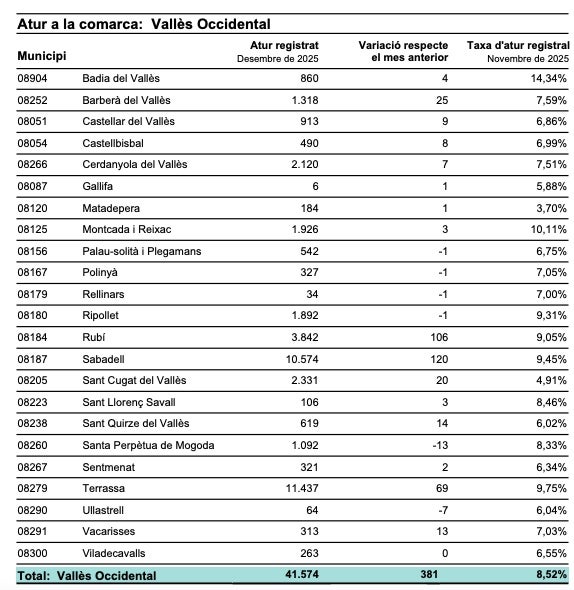 El màxim responsable ha remarcat que la baixada de l’atur és generalitzada a tots els sectors i totes les demarcacions territorials. I així ha estat també en els municipis del Vallès Occidental. Catalunya va acabar l’any 2025 amb un descens d’11.959 persones registrades a l’atur (-3,6%), situant la xifra global en 323.236 persones, la més baixa en un mes de desembre des de l’any 2007.