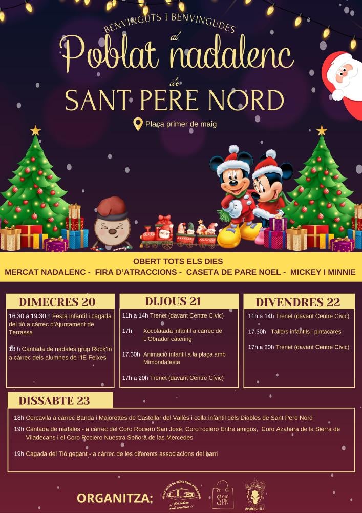 La plaza Primer de Maig se transforma en un poblado navideño. Desde el AVV Sant Pere Nord, SOM SNP y Diables de Sant Pere Nord se ha preparado toda una serie de actividades alrededor de estas fiestas para dar la bienvenida a los vecinos, promocionar el tejido socioeconómico del barrio, y ofrecer una alternativa lúdica y divertida a todas las familias.