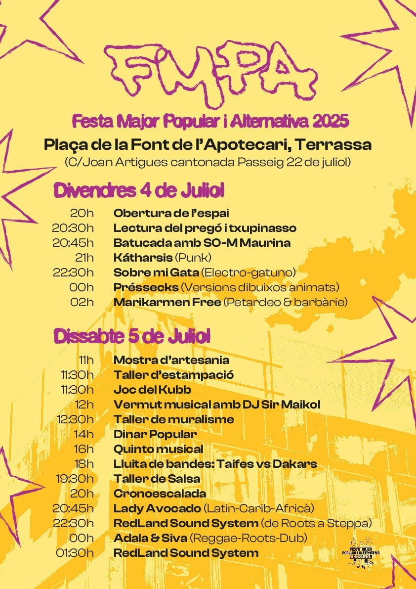 Vuelve la Fiesta Mayor Popular y Alternativa, un espacio abierto a la diversión pero también con clara conciencia social. Esta será la sexta edición de un evento que ha encontrado su lugar en la ciudad y que ofrece una opción más de ocio y espacio de encuentro durante el mismo fin de semana que tiene lugar la gran Fiesta Mayor de Terrassa. La coincidencia es buscada, ya que «como movimientos sociales anticapitalistas ofrecemos una propuesta hecha desde el Ayuntamiento, que no es que no nos parezca bien, sino que creemos que es complementaria o que busca objetivos diferentes», razonan desde las entidades impulsoras.