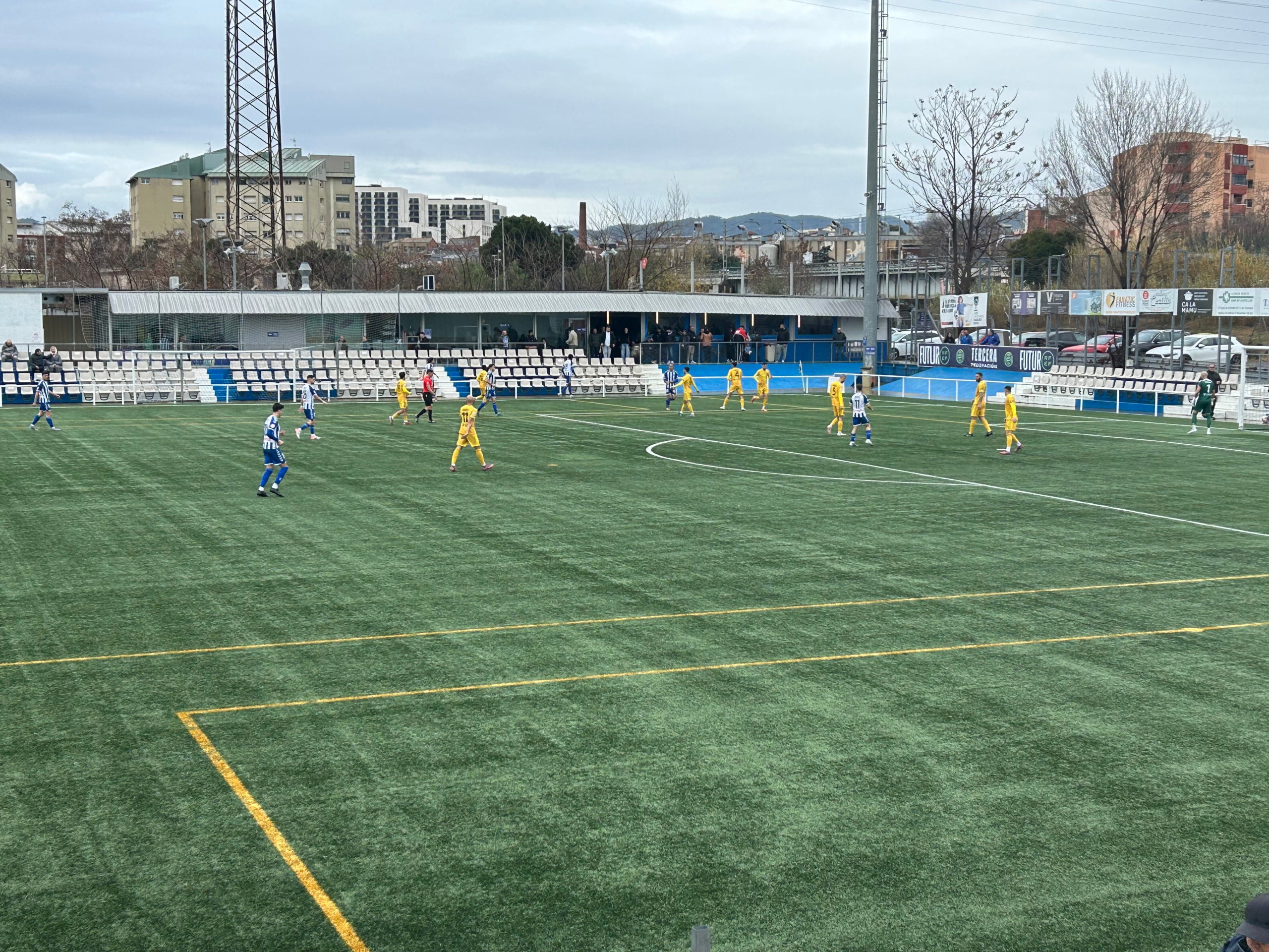 En la reanudación, el Hospitalet ha tenido el segundo gol en las botas de Dani y Buba. Max Llovera se ha dormido en salida de balón, y los jugadores visitantes lo han aprovechado para disparar hasta dos veces contra Carles Segura, pero el portero parroquial las ha detenido ambas. Una oportunidad que ha sido de las pocas de la segunda mitad. La lluvia ha comenzado a hacer acto de presencia y lo ha hecho con fuerza en Ca n’Anglada, y esto ha provocado que el terreno de juego estuviera irregular y que los jugadores estuvieran imprecisos.