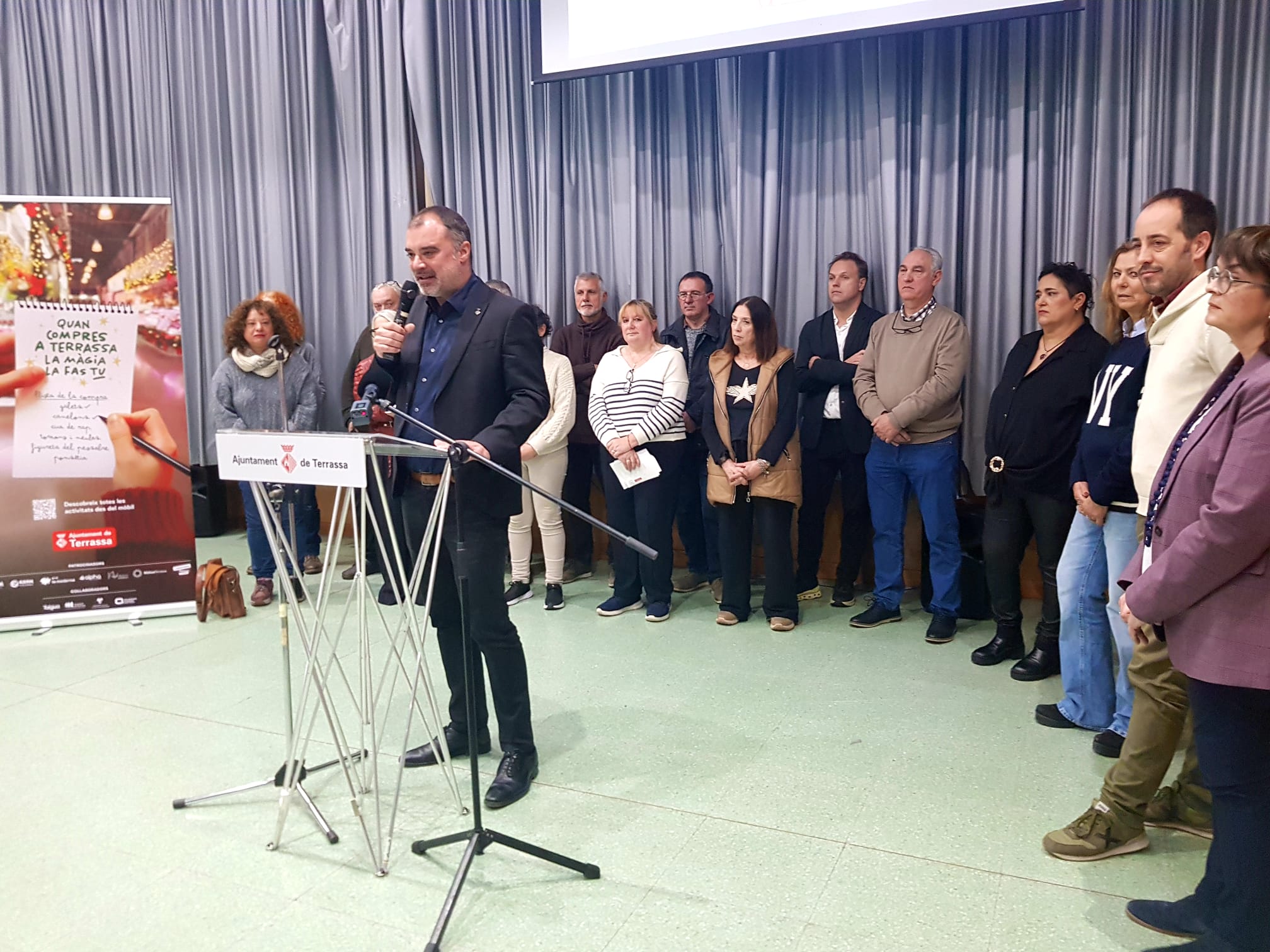 «El comercio de proximidad es quien da sentido e identidad a una ciudad», ha recalcado el alcalde Jordi Ballart en el acto de presentación de la campaña de Navidad de los ejes comerciales de Terrassa. Durante todo el año, los establecimientos forman parte del día a día de los ciudadanos, pero es, especialmente, en épocas como ahora, cuando su presencia se convierte en vital para mantener el ambiente y la vida en los barrios. Esto lo tienen muy claro las asociaciones de comerciantes y vecinales que, este jueves, día 4 de diciembre, han querido exponer qué acciones han preparado para estas fechas tan señaladas, con el objetivo de que ningún habitante de Terrassa tenga que salir de la ciudad para llenar de regalos su hogar.