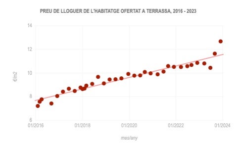 El precio del alquiler en Terrassa ya supera los 1.000 euros mensuales de media. Son datos recopilados en el informe del cuarto trimestre de 2023 por el Servicio de Estudios y Observatorio de la Ciudad, en que se indica que a finales del año 2023 alquilar una vivienda a la cocapital vallesana tenía un coste mediano de 1.037,4 euros. Esto supone un incremento respecto al anterior trimestre, cuando la cifra se había quedado por encima de la barrera psicológica de los mil euros, en concreto, en 964,3 euros. Así es pues como el precio de la vivienda usada en régimen de alquiler se ha incrementado en casi un 9% en pocos meses, y el municipio cierra el año con una diferencia de un 16,8% respecto a un año antes.