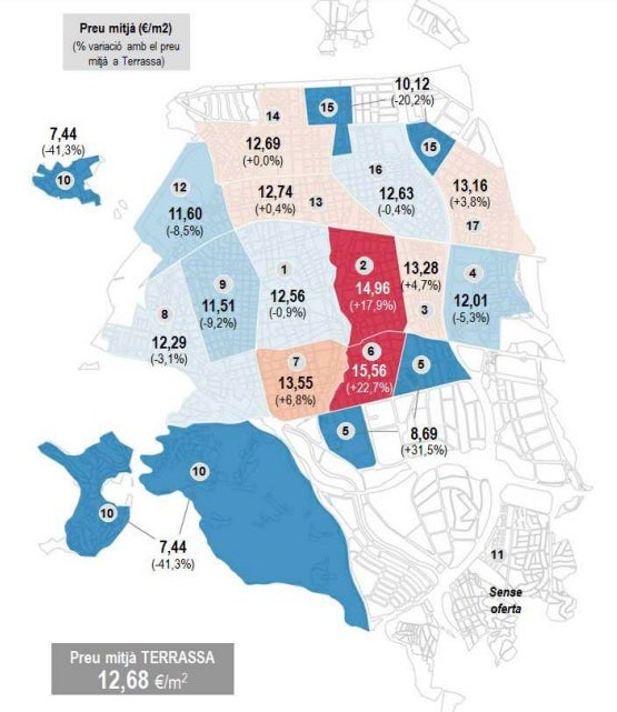 En este trimestre los diferenciales de precios más elevados los encontramos en los barrios limítrofes al Parque de Vallparadís: un 17,9% al conjunto de los barrios del Antiguo Pueblo de Sant Pere, Vallparadís, Cementerio Viejo y Plaza Cataluña-Escuela Industrial (zona 2); o hasta un 22,7% en el barrio de Can Palet). Esto quiere decir que son las zonas en que más han notado un incremento de precios desde inicio a finales de año. Por ejemplo, en un año, en la zona 2 se ha pasado de los 10,14 euros al m² a los 14,96 € actuales, o a Can Palet se ha pasado de los 10,76 €/m² a los 15,56 €/m².