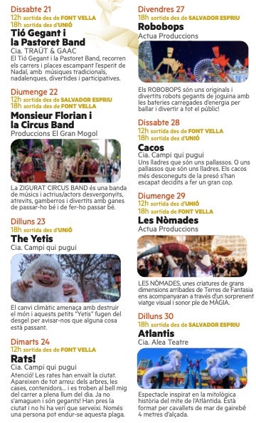 Y además, desde Terrassa Centre y el Ayuntamiento de Terrassa también se han preparado toda una serie de espectáculos itinerantes por las calles del Centro que se iniciarán este sábado día 21 y se prolongarán hasta el lunes día 30 de diciembre.