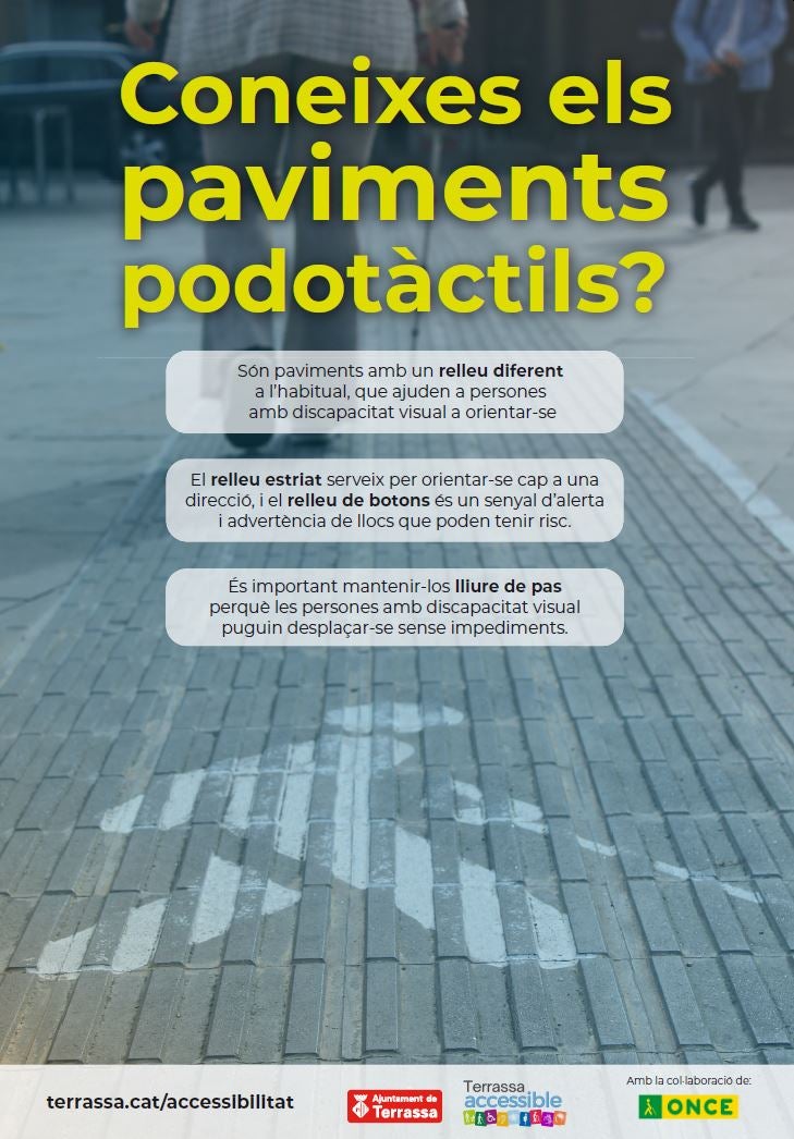 Terrassa ha puesto en marcha una campaña para sensibilizar a la ciudadanía sobre los pavimentos específicos para personas con discapacidad visual. Todavía hay muchos egarenses que desconocen la función de estos botones o estriados que se pueden encontrar en las aceras de la ciudad, y el Ayuntamiento quiere poner solución a ello. Por eso, la Oficina de Accesibilidad Municipal, con la colaboración de la fundación ONCE, ha puesto en marcha una acción de difusión en todo la ciudad donde los pavimentos podo-táctiles son los protagonistas. La idea es que todo el mundo los reconozca y sepa cual es su función y la necesidad de respetarlos y cuidarlos.