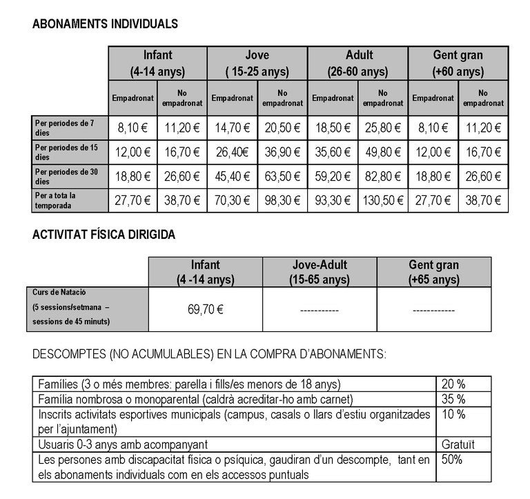 Finalmente, hay que destacar que se establecen diferentes descuentos en los abonos para diferentes colectivos como son las familias, las familias numerosas o monoparentales, las personas inscritas en actividades deportivas municipales y las personas con discapacidad. Podéis consultar más información sobre la piscina así como la lista completa de precios aquí.