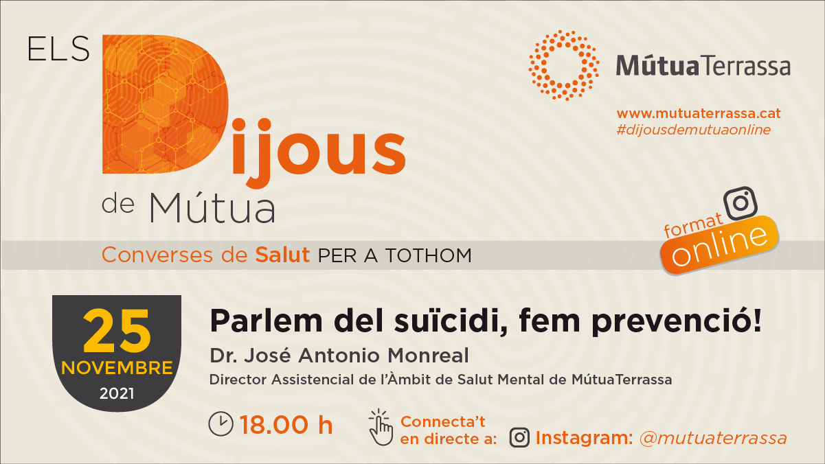 El proper dijous, 25 de novembre, se celebra una nova conversa -l’última d’aquest 2021- en el marc del cicle “Dijous de Mútua” i sota el títol “Parlem del suïcidi, fem prevenció!”. Es podrà seguir a través de l’emissió en directe per l’Instagram de MútuaTerrassa i pel Facebook Live de Món Terrassa a partir de les 18 hores.