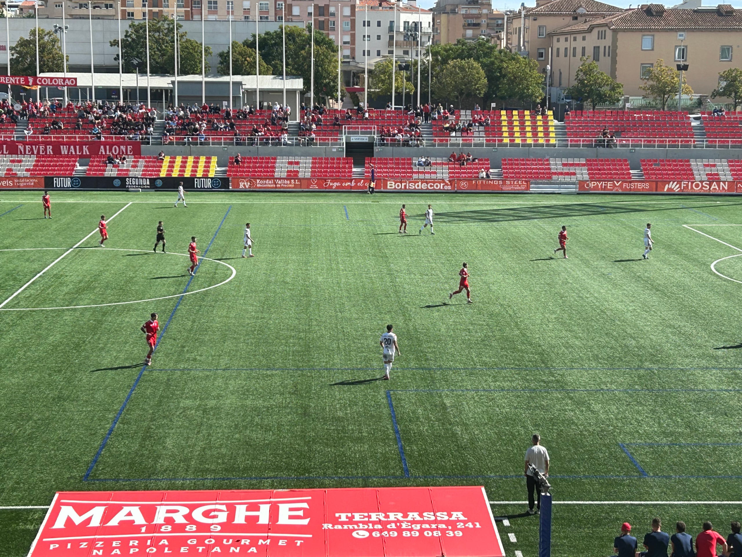 El gol ha arribat massa d’hora per a un Terrassa FC molt afectat per l’expulsió. Era el moment de baixar pulsacions i d’intentar que passessin poques coses, però els visitants continuaven collant la porteria terrassenca. Al minut 68, han tingut l’empat a les botes de Gabri Santos, que s’ha quedat sol contra Marcos Pérez, però el seu xut ha sortit desviat per alleujament egarenc. I no ha estat l’única opció de gol pels visitants, que han xutat repetidament a porteria. En aquest sentit, Marcos i la poca efectivitat visitant han ajudat el Terrassa FC a aconseguir una victòria molt patida. De fet, en els minuts finals, la tensió ha augmentat per una jugada molt semblant a la de l’expulsió terrassista, però en el bàndol contrari. No obstant això, en aquesta ocasió, l’àrbitre ha ensenyat la targeta groga. Tot plegat ha acabat amb l’expulsió de Víctor Bravo per protestar.