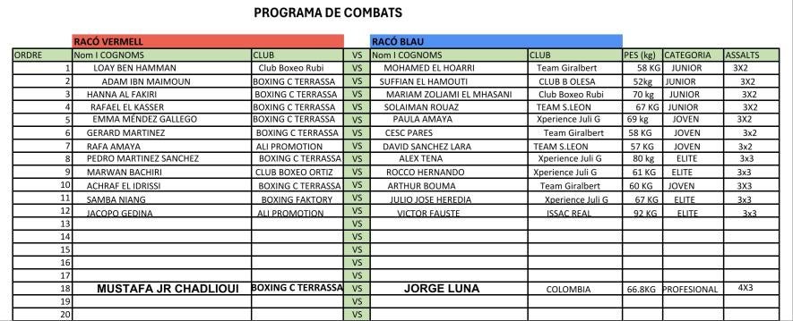El darrer a saltar a la lona serà Musta Jr, però abans tindrem fins a dotze combats amateurs. Deu seran de categoria masculina, i dos de femenina. Això és un èxit històric per al club, ja que disposen de dues boxejadores, de 16 i 17 anys, per debutar gràcies al projecte Educaboxing. Dels combats masculins, vuit seran de joves entre 15 i 17 anys. S’enfrontaran a diferents rivals procedents de Rubí, Sabadell, Premià de Dalt, Olesa de Montserrat, Barcelona, Castelldefels o de Terrassa mateix. D’aquests, set seran combats ràpids, de tres assalts de dos minuts, mentre que els cinc restants seran de tres assalts de tres minuts.