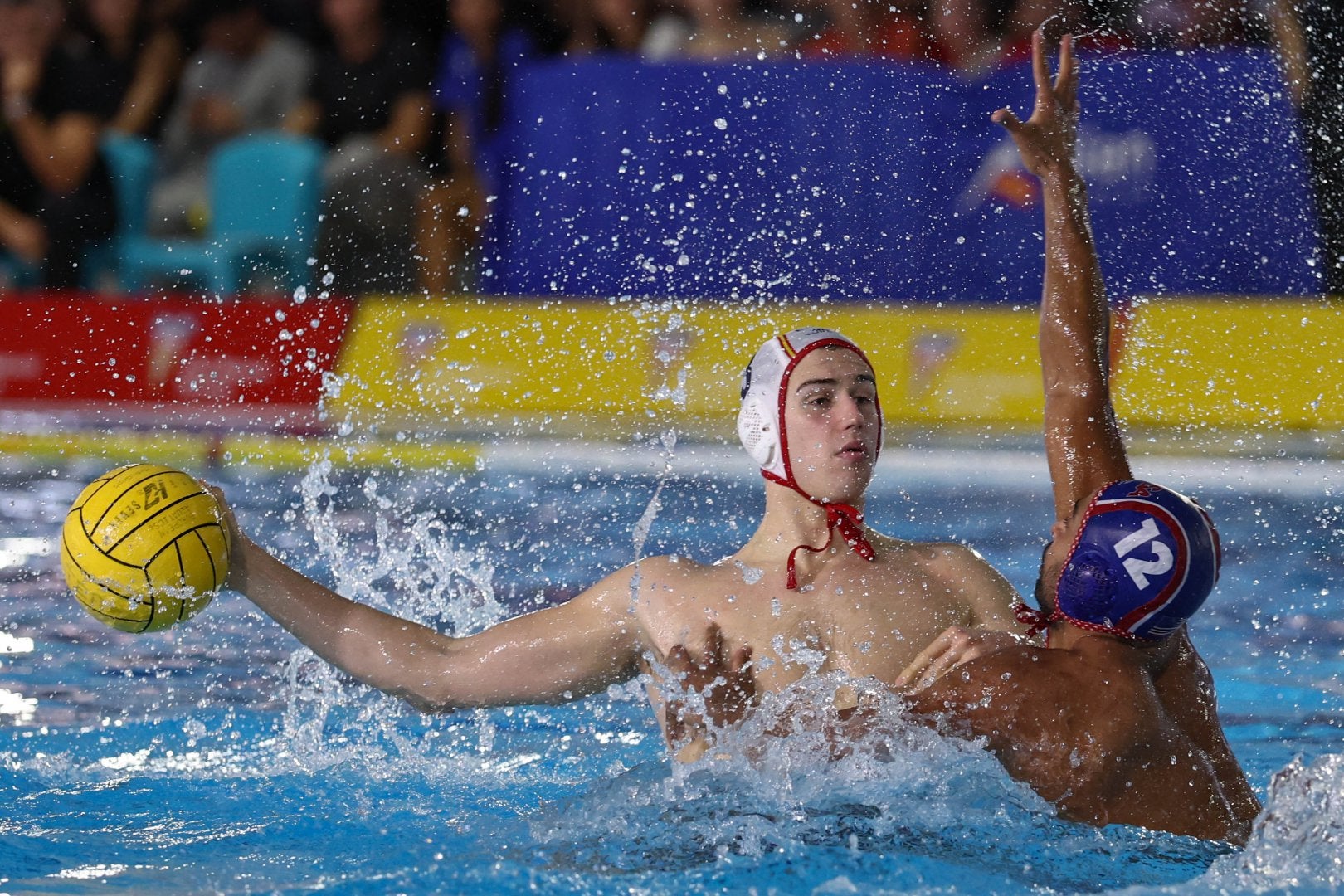 Espanya ha començat l’enfrontament amb molt bon peu. Albert Sabadell, waterpolista del CN Terrassa, ha estat l’encarregat d’obrir el marcador pels locals. Poc després, Edu Lorrio ha fet la segona diana, però els americans han retallat distàncies amb un gol de Saveljic. Finalment, els de David Martín han aconseguit mantenir-se per davant al marcador i han marxat al primer descans amb un parcial de 4-1. Durant el segon quart, però, el patit ha pres un clar accent americà. Malgrat que Fran Valera ha anotat el 5-1, el combinat estatunidenc ha pres el control del joc i han remuntat el partit, firmant un parcial de 2-6 i arribant al descans llarg amb un 7-7 al marcador.