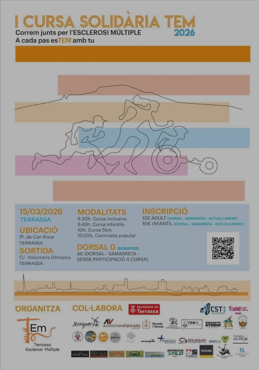 El pròxim diumenge, dia 15 de març, la plaça de Can Roca de Terrassa acollirà la celebració de la primera Cursa Solidària per l’Esclerosi Múltiple de Terrassa. Aquesta cita esportiva, organitzada per l’entitat Terrassa Esclerosi Múltiple (TEM), neix amb la voluntat de visibilitzar aquesta malaltia minoritària i, a la vegada, recaptar diners per a l’entitat.