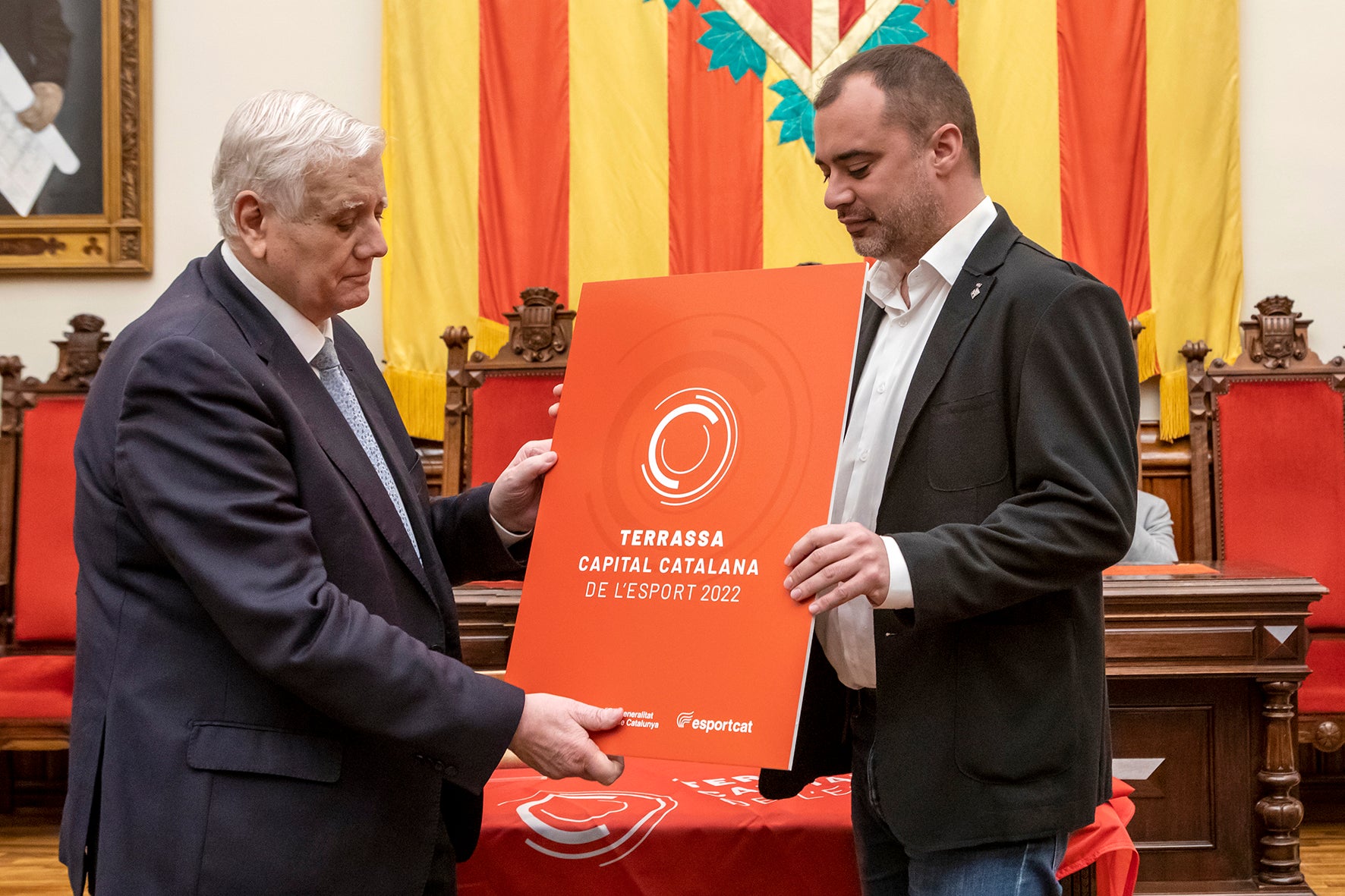 Terrassa ha rebut la bandera i el distintiu com a Capital Catalana de l’Esport. Aquest dimecres, 4 de maig, en un acte que ha tingut lloc a la Sala de plens de l’Ajuntament de Terrassa, el president de la Fundació Catalana de l’Esport, Pere Sust, ha lliurat els emblemes a l’alcalde Jordi Ballart i al regidor d’Esports, Miguel Ángel Moreno, amb el beneplàcit de l’Associació de Capitals i Ciutats Europees de l’Esport. L’acte ha comptat també amb la presència de la tinenta d’alcalde de Promoció Econòmica i Projecció de la Ciutat, Núria Marín; de portaveus dels Grups Municipals; així com de representants de clubs i entitats membres del Consell Municipal d’Esports.