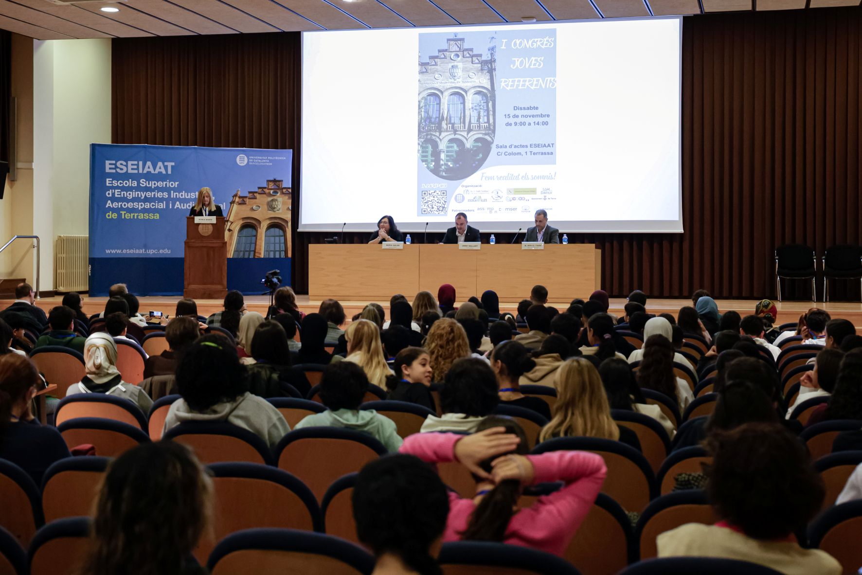 Aquest dissabte ha tingut lloc el primer Congrés de Joves Referents, celebrat a la Sala d'Actes de l'Escola Superior d'Enginyeries Industrial, Aeroespacial i Audiovisual de Terrassa (ESEIAAT). L’esdeveniment ha estat organitzat per l’ESEIAAT, la Sindicatura de Greuges de Terrassa, l’Associació de Professorat Odissea, l’Associació Darna, i les escoles i AFAs Mare de Déu de Montserrat, El Vallès i l’Institut Escola Antoni Ubach. L’esdeveniment busca inspirar i motivar els participants perquè estableixin altes expectatives per a ells mateixos i reflexionin sobre com treballar per fer realitat els seus somnis | Lluís Clotet