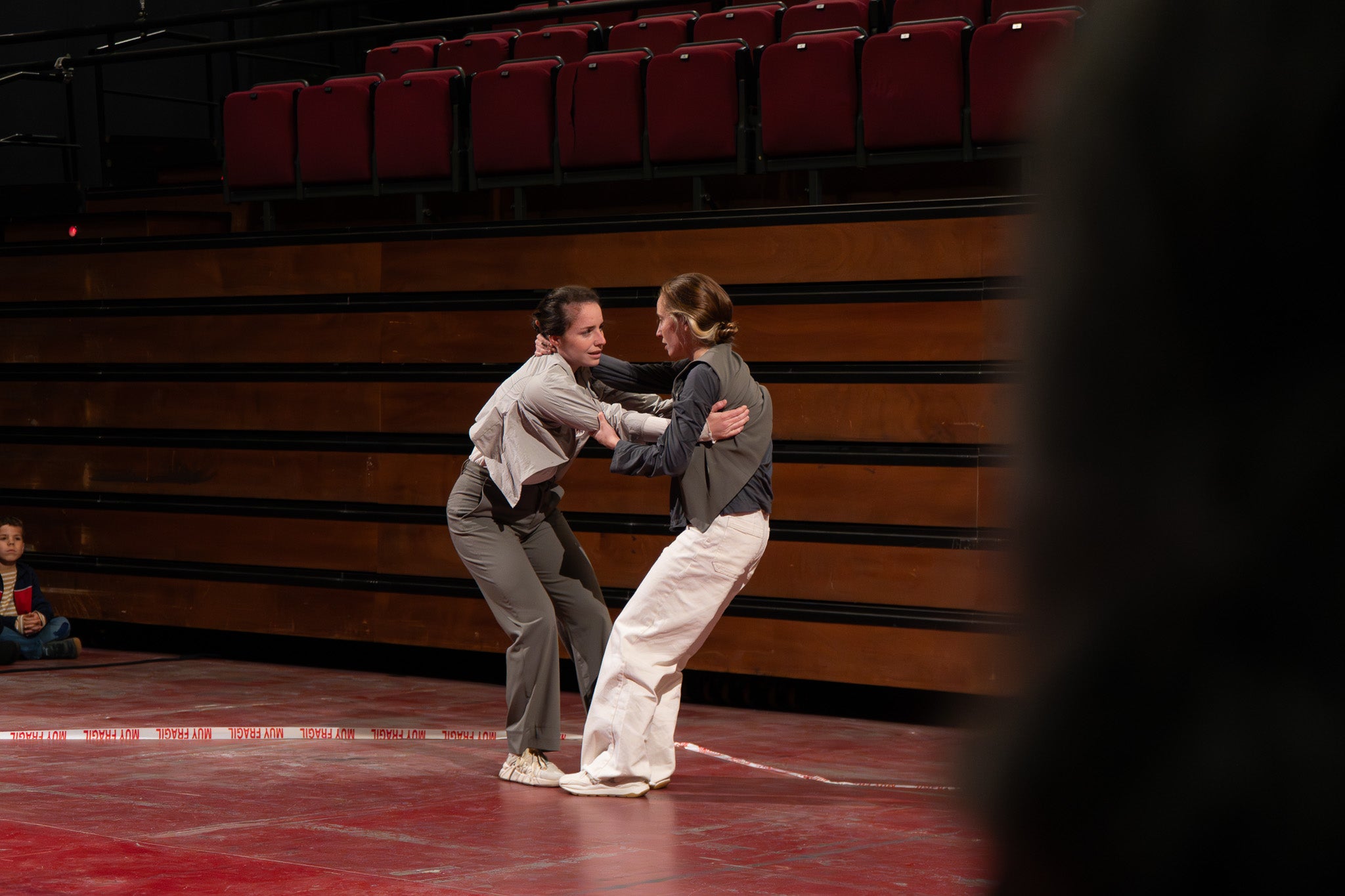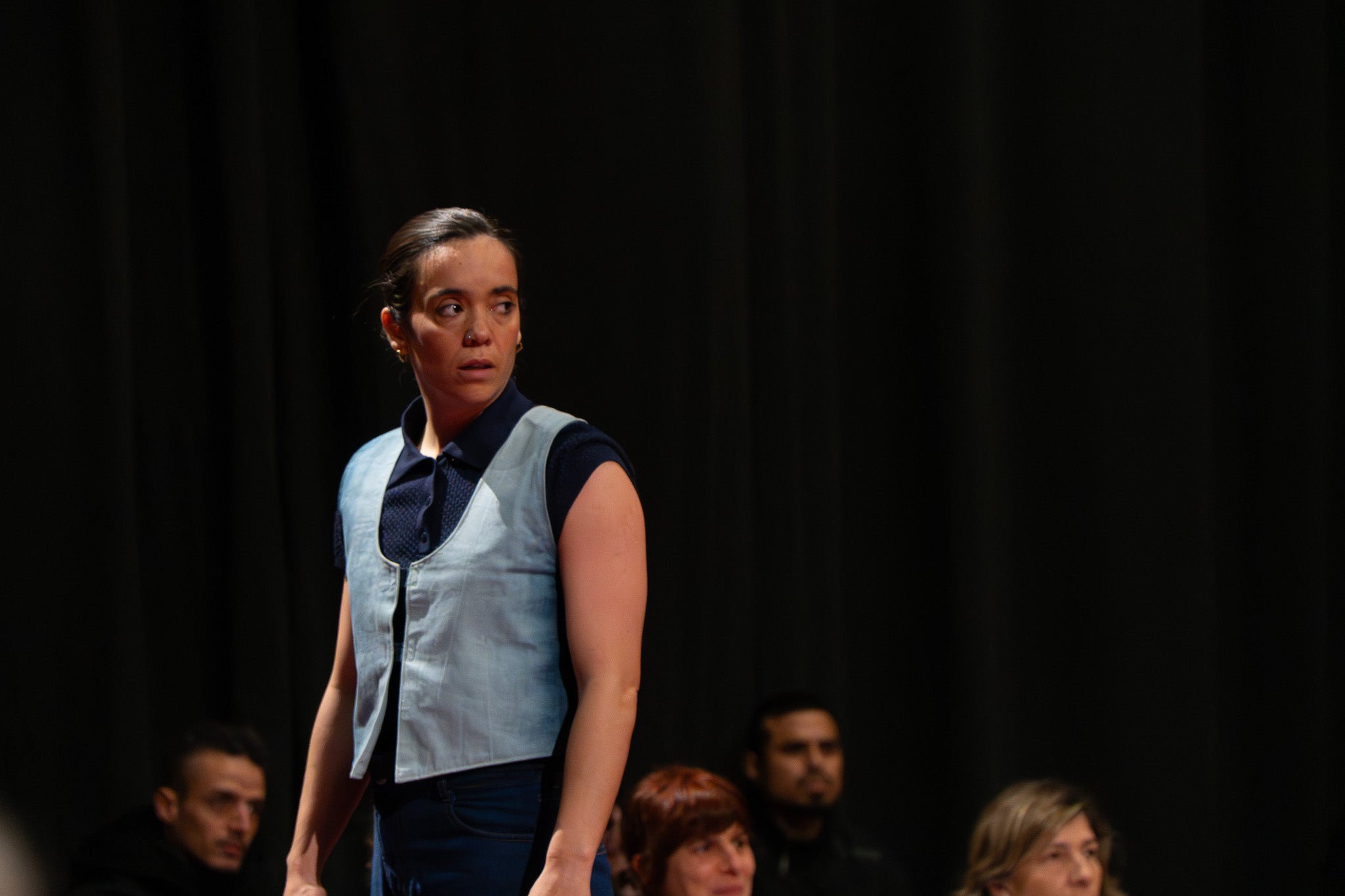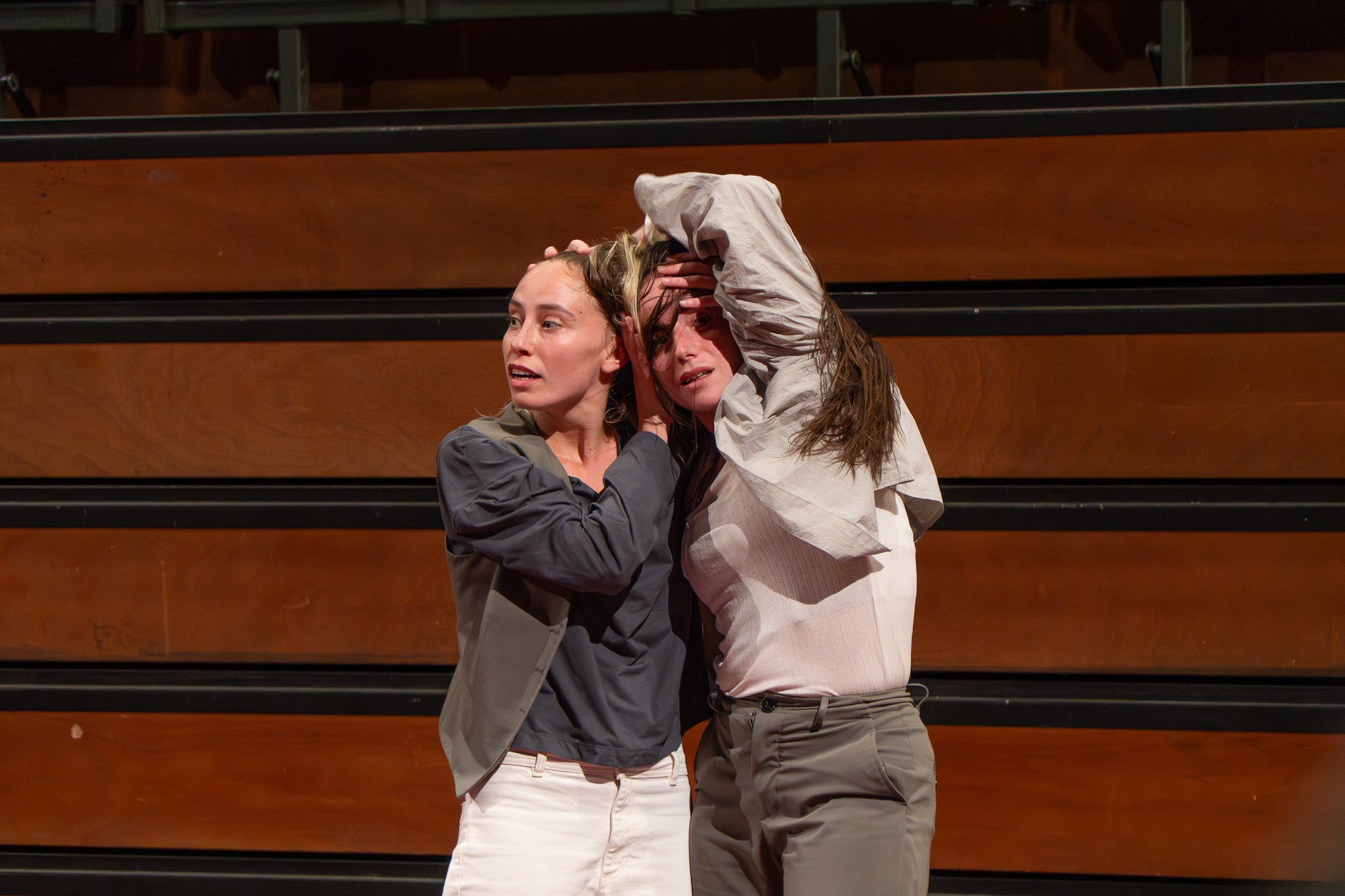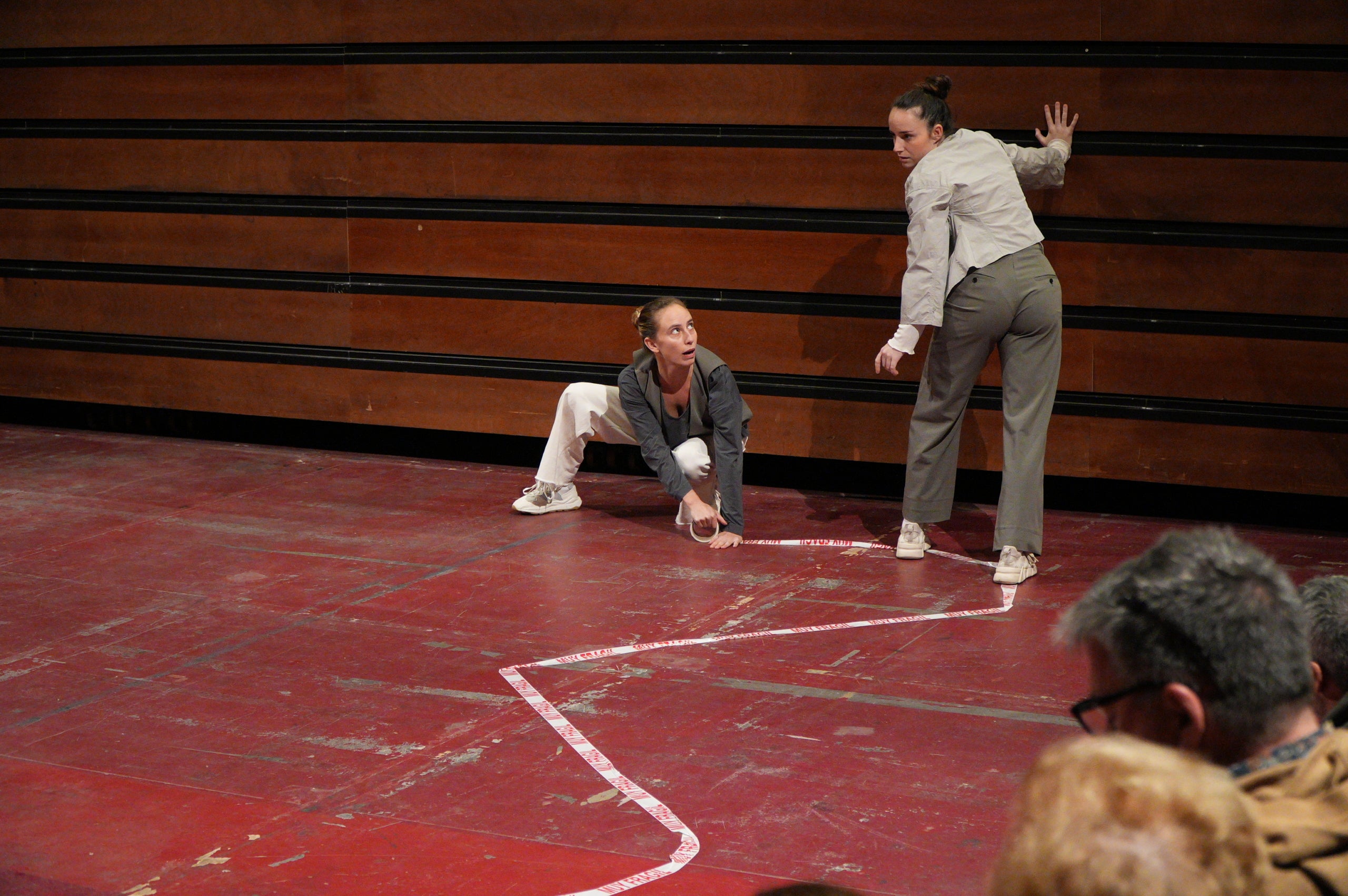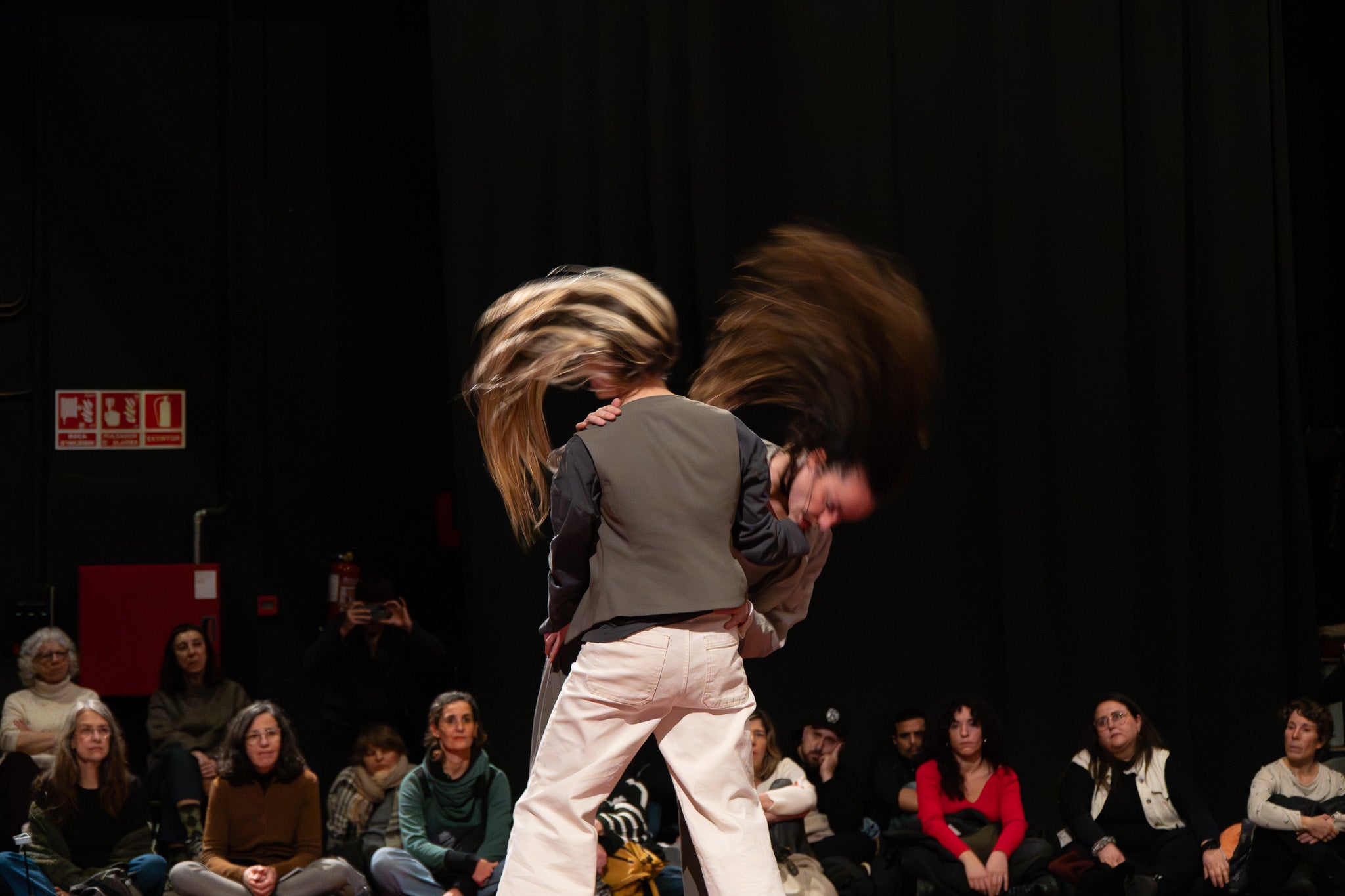La pluja va obligar a traslladar la programació de Dansa Metropolitana prevista a l’aire lliure a un espai tancat, però això no va ser obstacle perquè el públic s’hi acostés. Va ser un doble espectacle amb “Pies de gallina”, a càrrec d'Ana F Melero i Luna Sánchez, i “A medio camino”, d’Angés Sales i Héctor Plaza amb tres dones com a protagonistes | Jan Romero