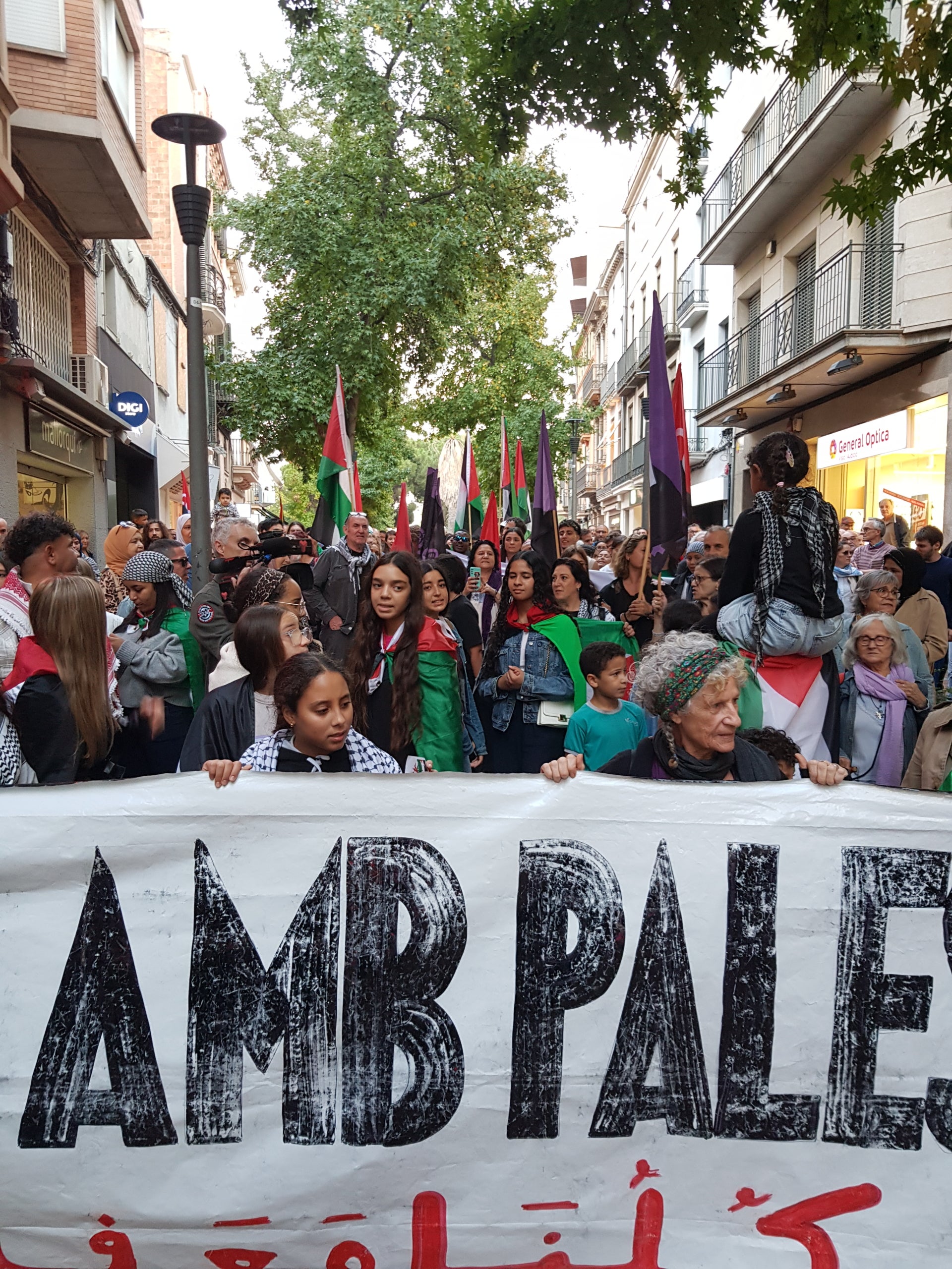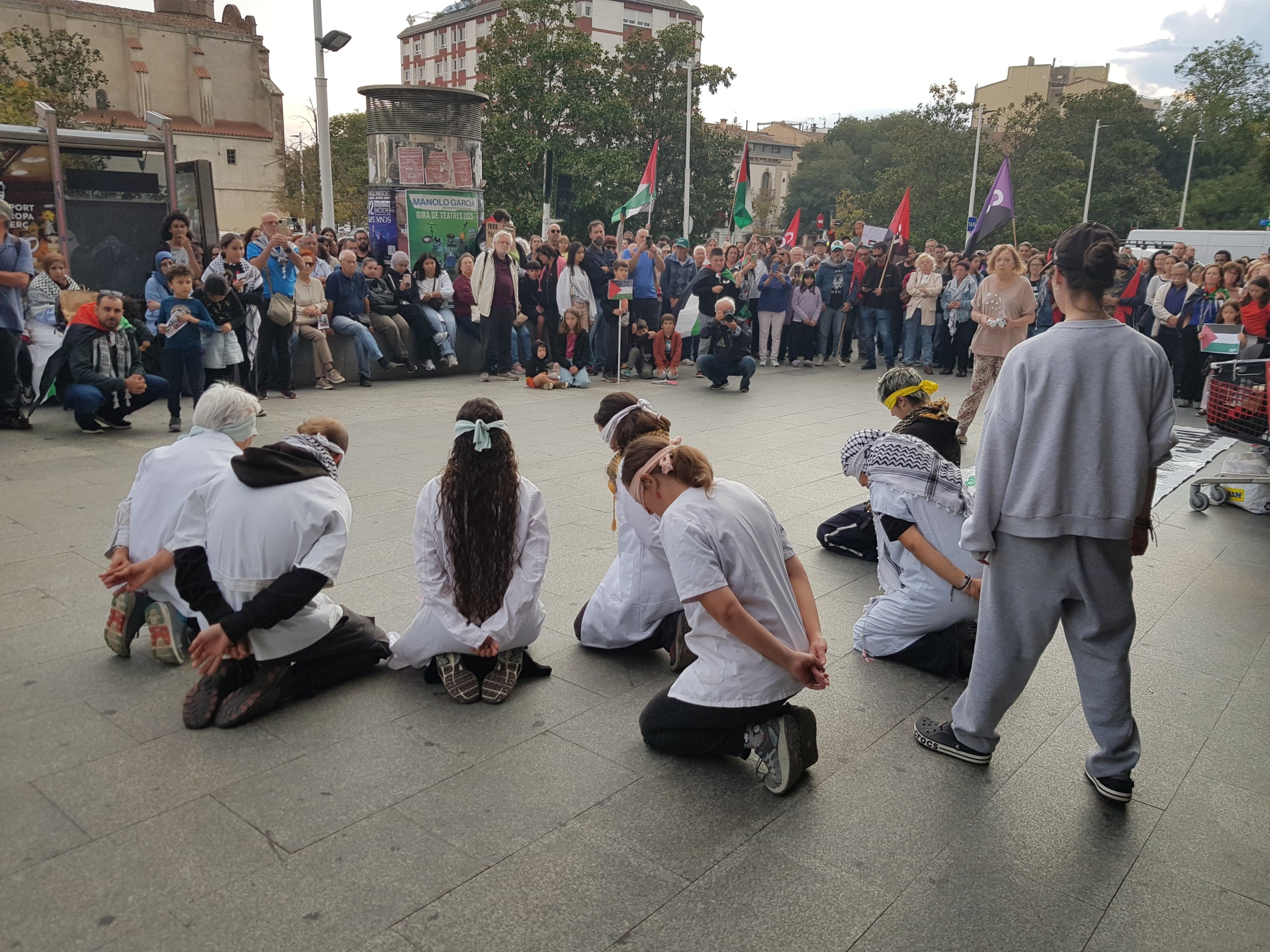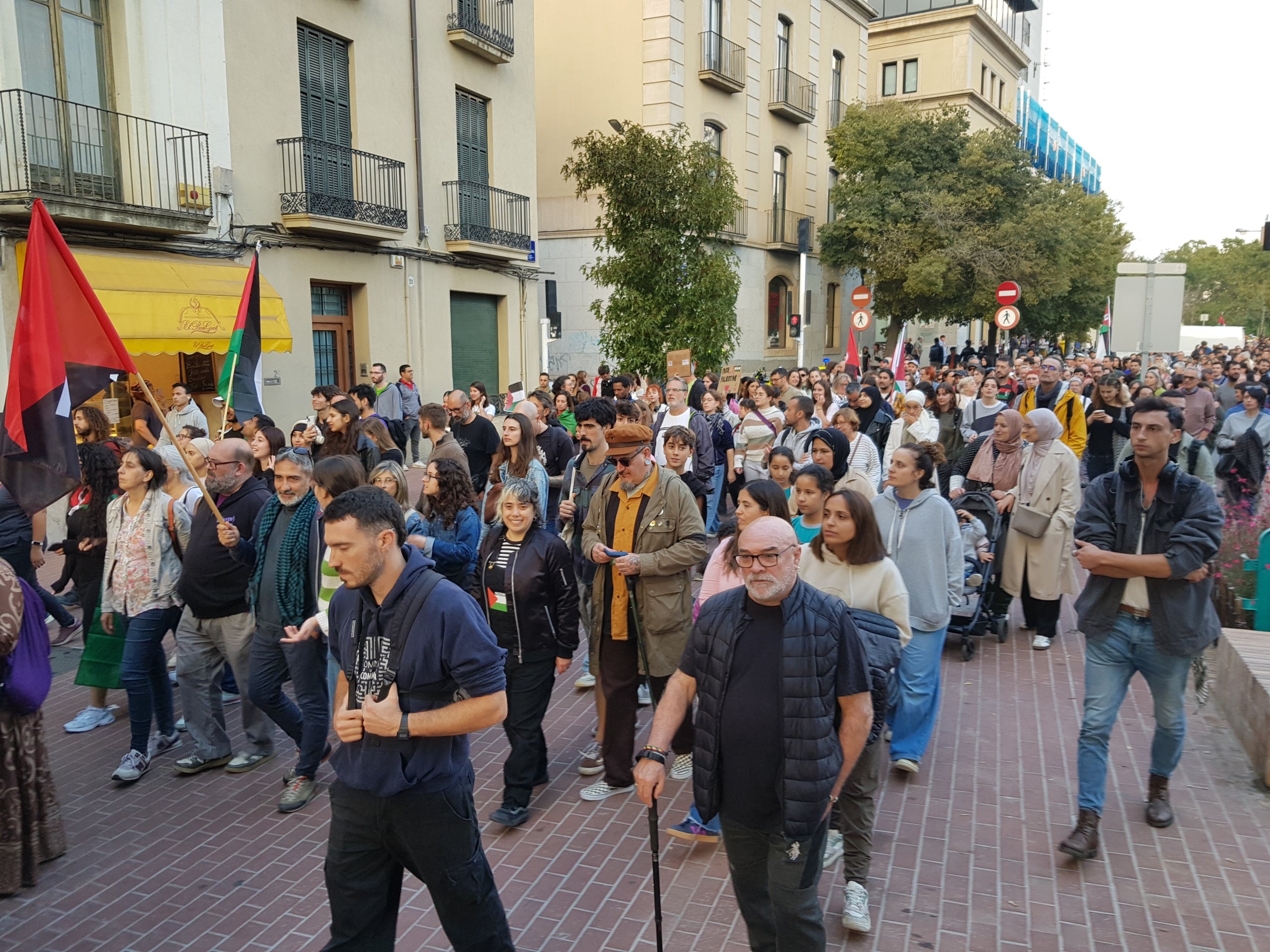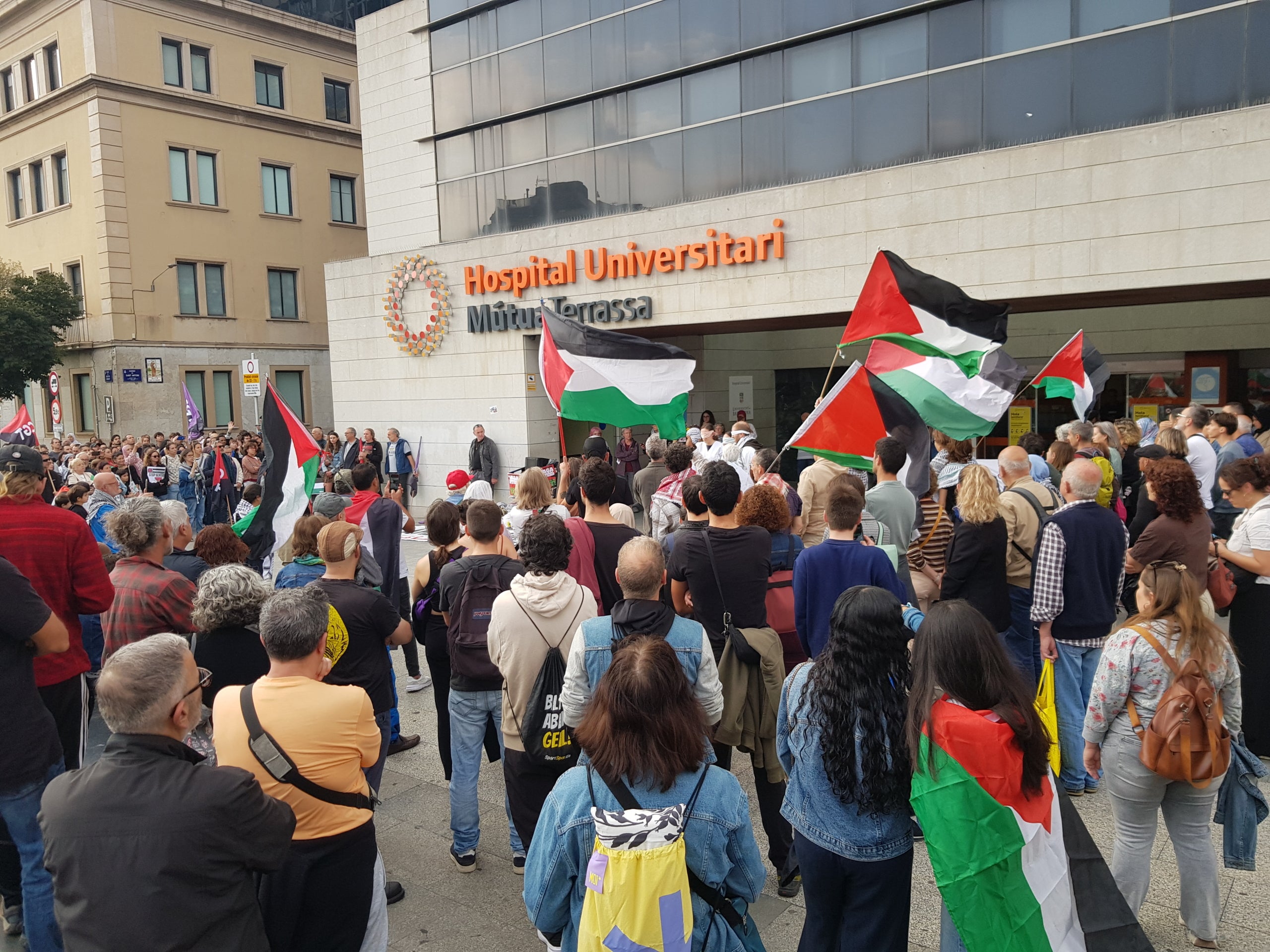 Terrassa s’ha adherit a la Vaga General per al poble palestí amb una manifestació que ha recorregut els carrers del Centre de la ciutat. La convocatòria, feta des Terrassa amb Palestina i sindicats com COS i CGT s’ha iniciat des de davant de MútuaTerrassa, on s’ha volgut denunciar amb una performance i un manifest “la vulneració del dret internacional per part d’Israel” i al mateix temps “homenatjar el personal sanitari de Gaza” que ha estat salvant vides. La manifestació ha transcorregut amb càntics a favor d’una Palestina lliure i d’un boicot a Israel. Amb algunes aturades per llegir testimonis i manifest, i amb intents de tancar comerços que no han prosperat, la comitiva ha arribat fins al Raval, on s’ha fet l’acte de cloenda | Lluïsa Tarrida