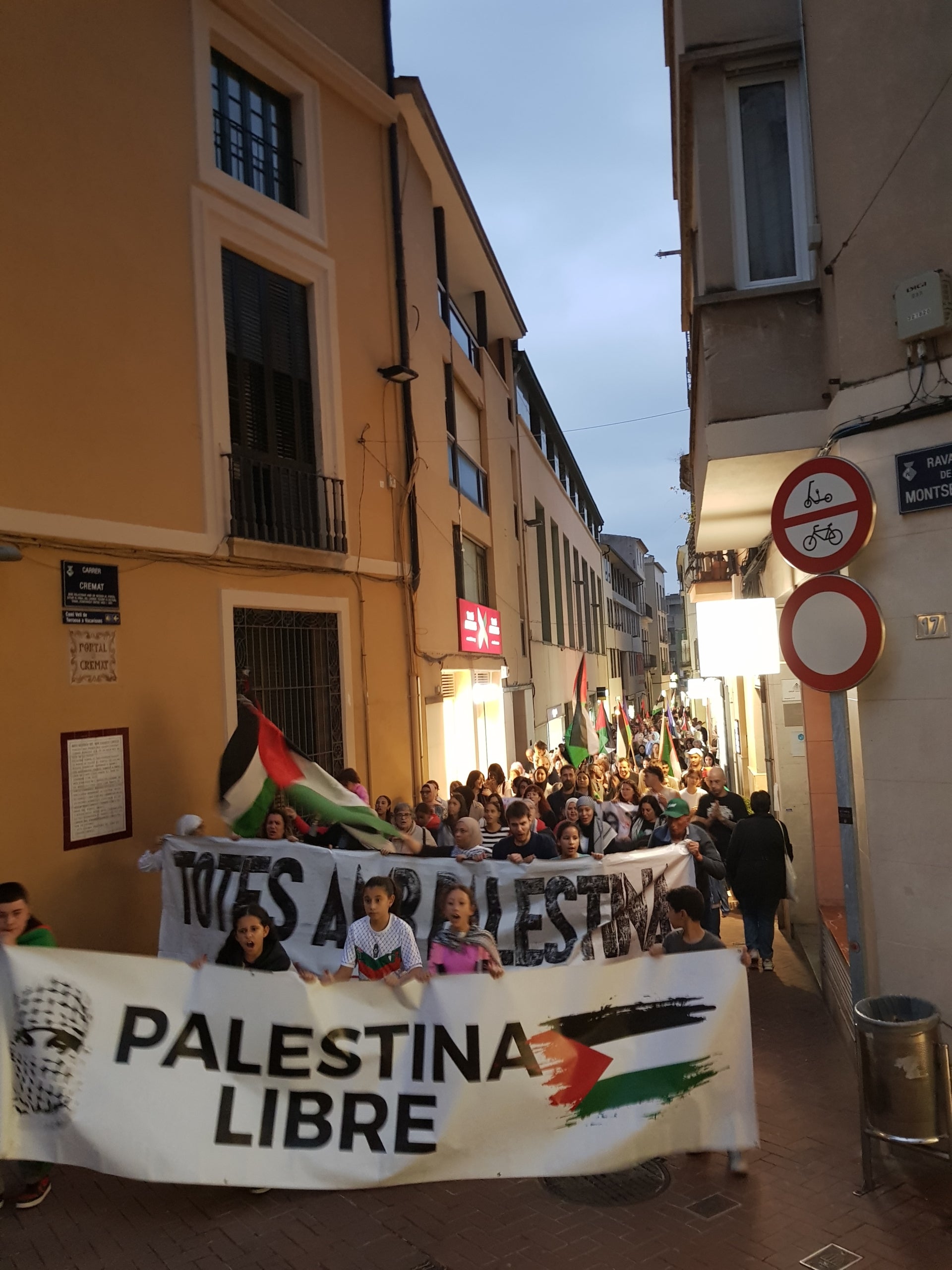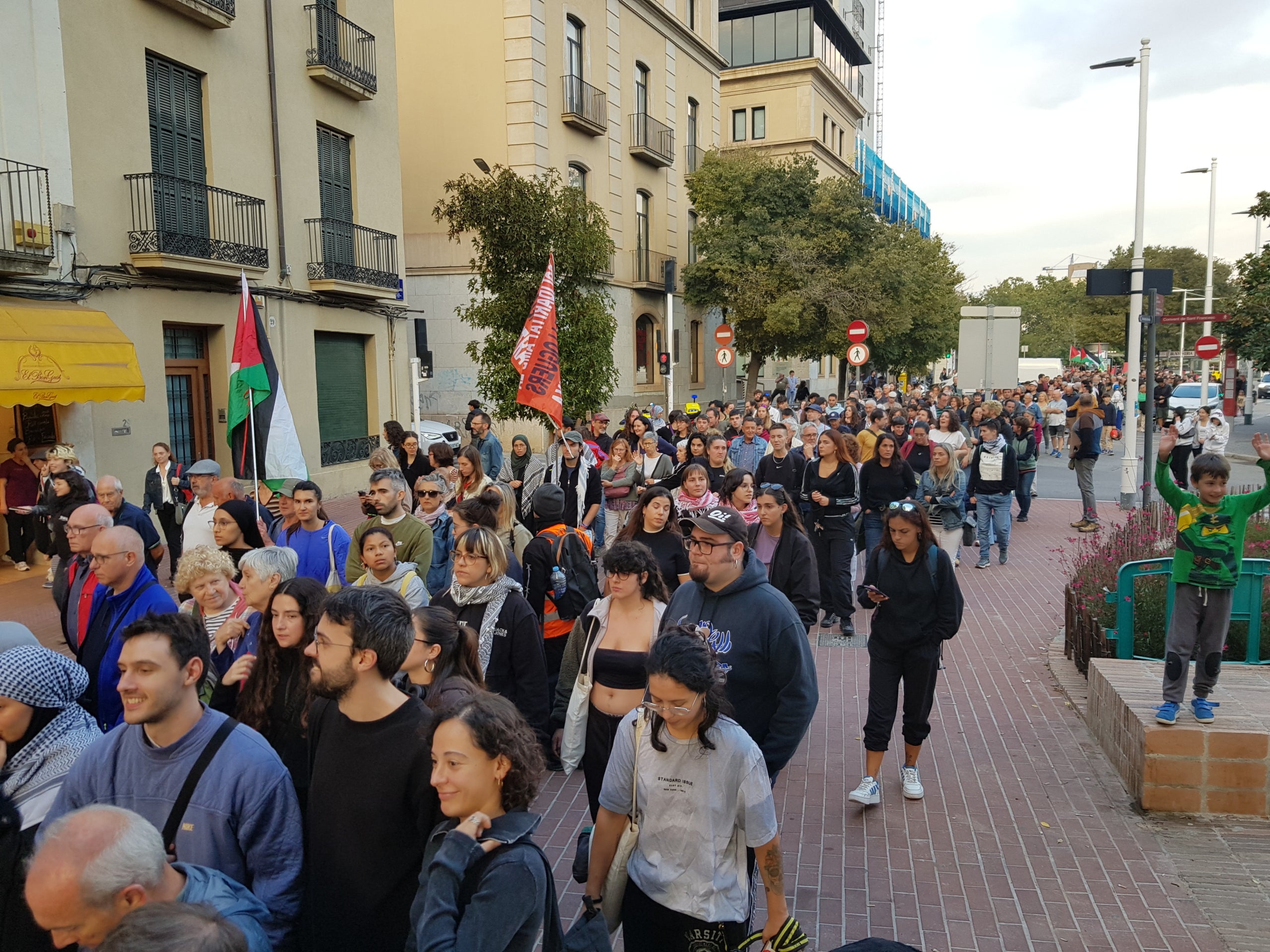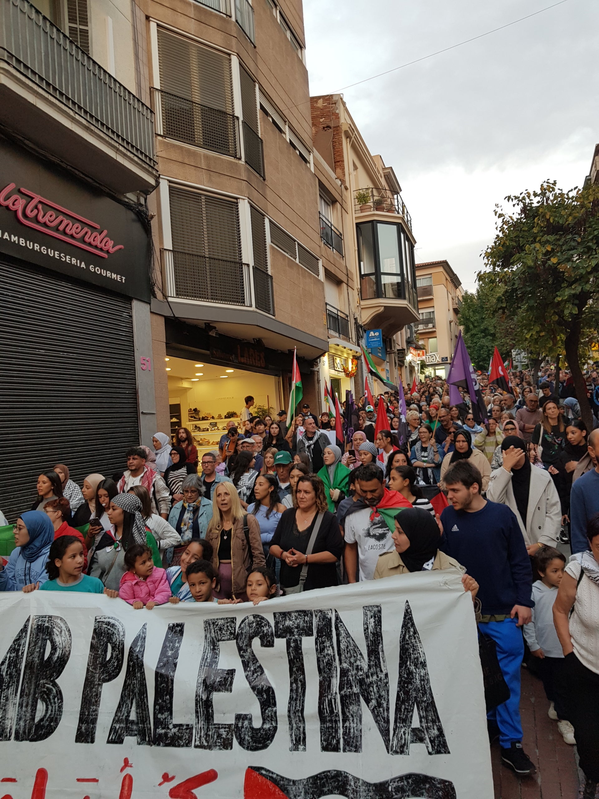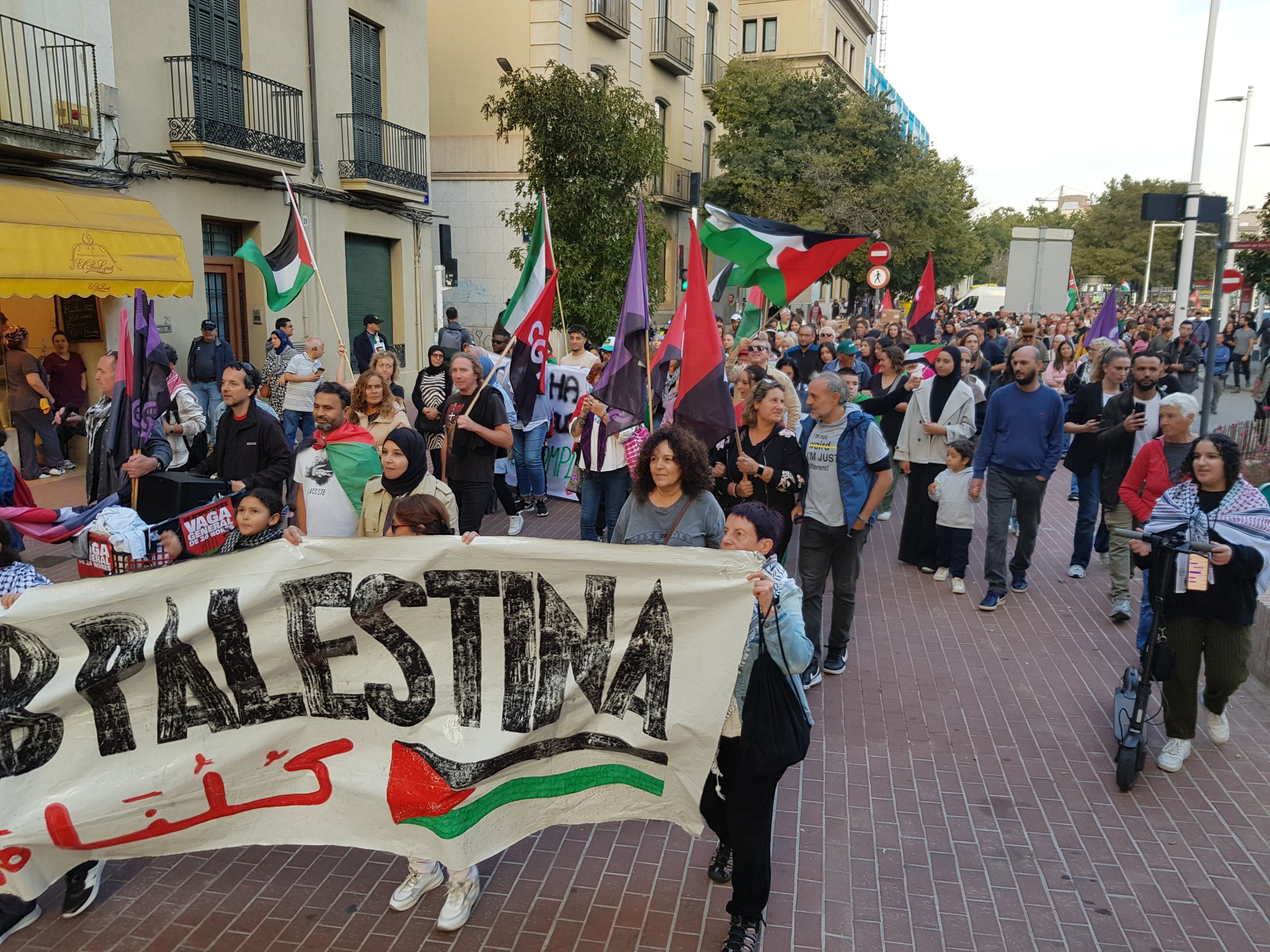 Terrassa s’ha adherit a la Vaga General per al poble palestí amb una manifestació que ha recorregut els carrers del Centre de la ciutat. La convocatòria, feta des Terrassa amb Palestina i sindicats com COS i CGT s’ha iniciat des de davant de MútuaTerrassa, on s’ha volgut denunciar amb una performance i un manifest “la vulneració del dret internacional per part d’Israel” i al mateix temps “homenatjar el personal sanitari de Gaza” que ha estat salvant vides. La manifestació ha transcorregut amb càntics a favor d’una Palestina lliure i d’un boicot a Israel. Amb algunes aturades per llegir testimonis i manifest, i amb intents de tancar comerços que no han prosperat, la comitiva ha arribat fins al Raval, on s’ha fet l’acte de cloenda | Lluïsa Tarrida