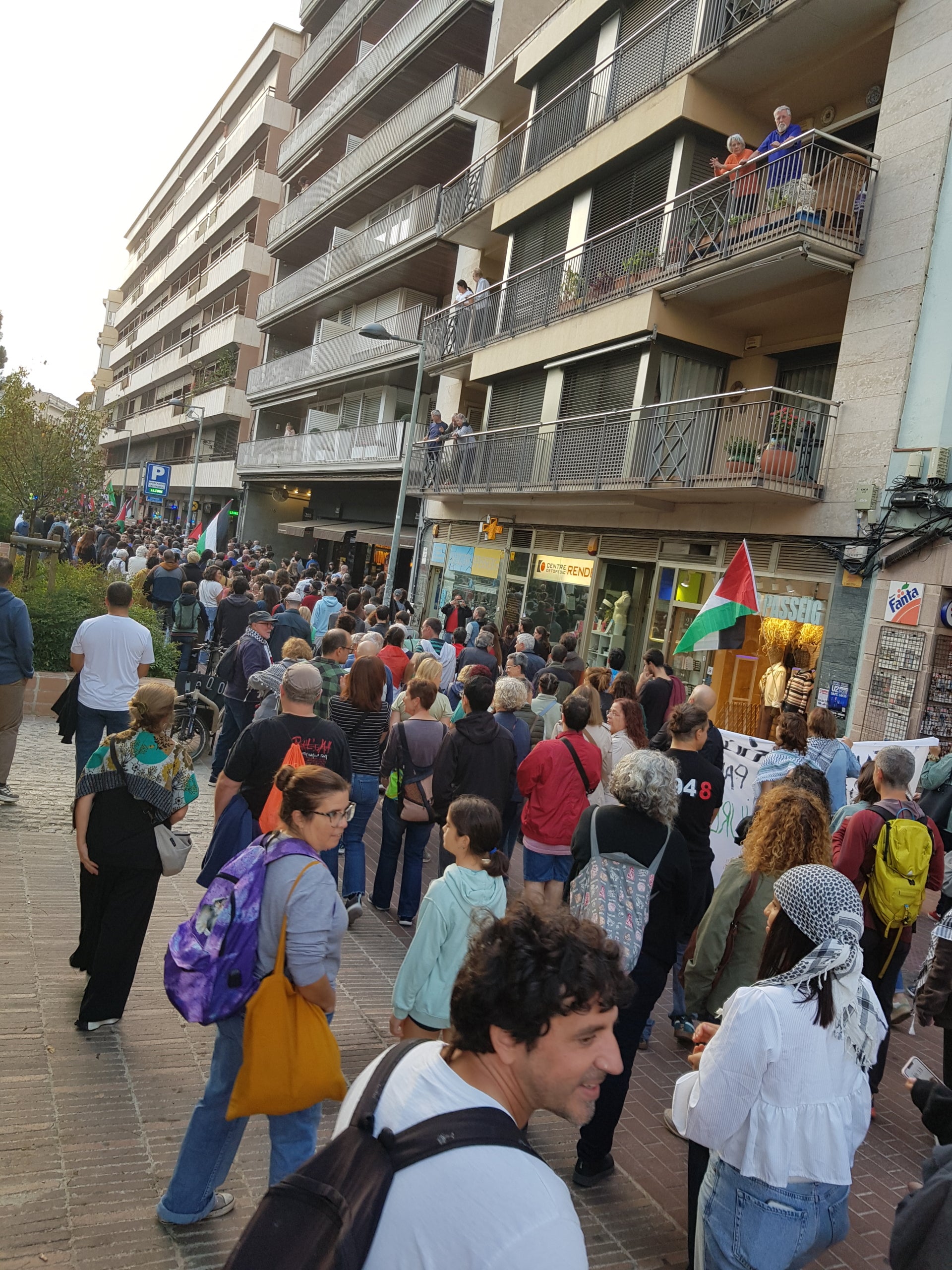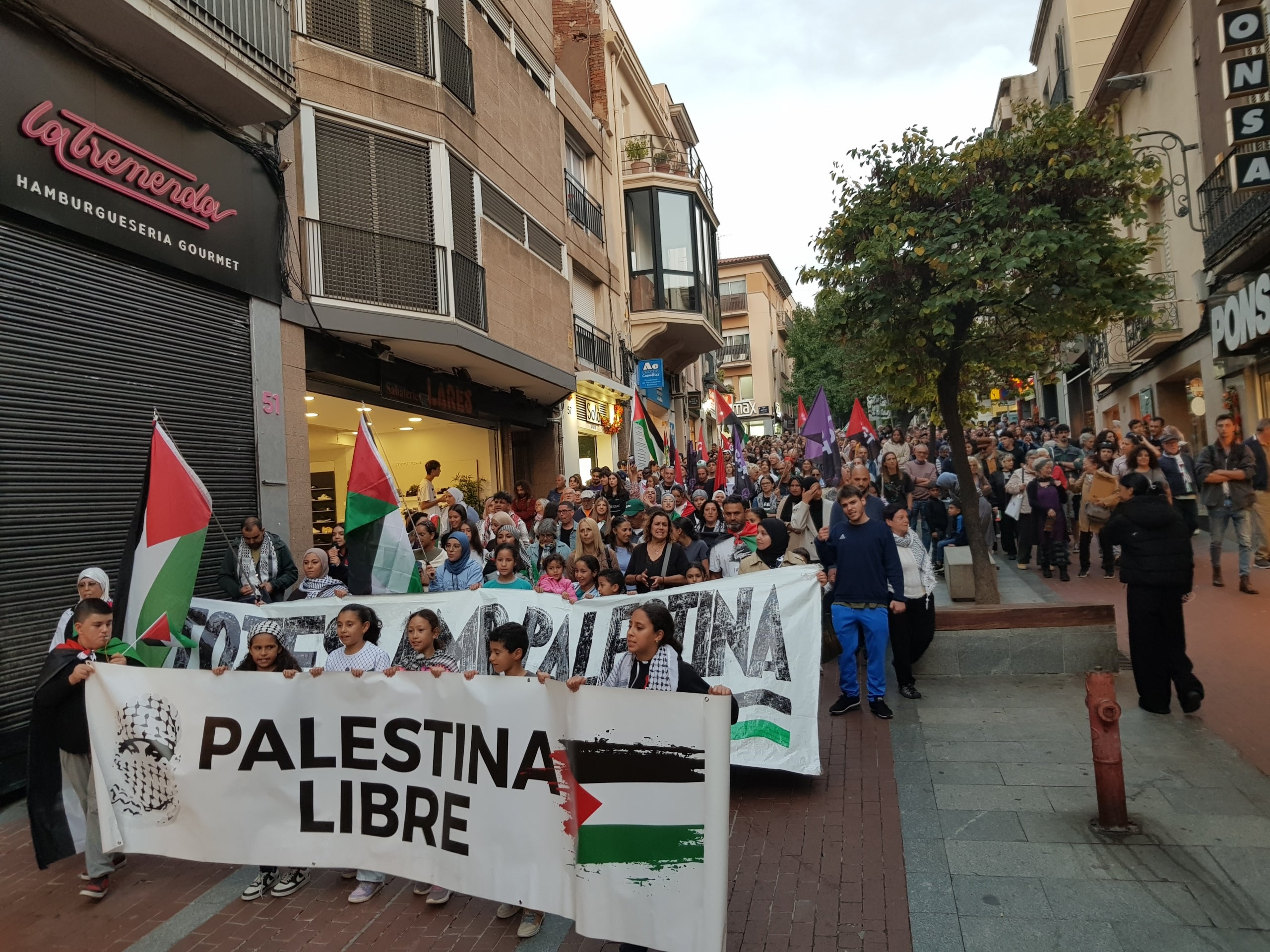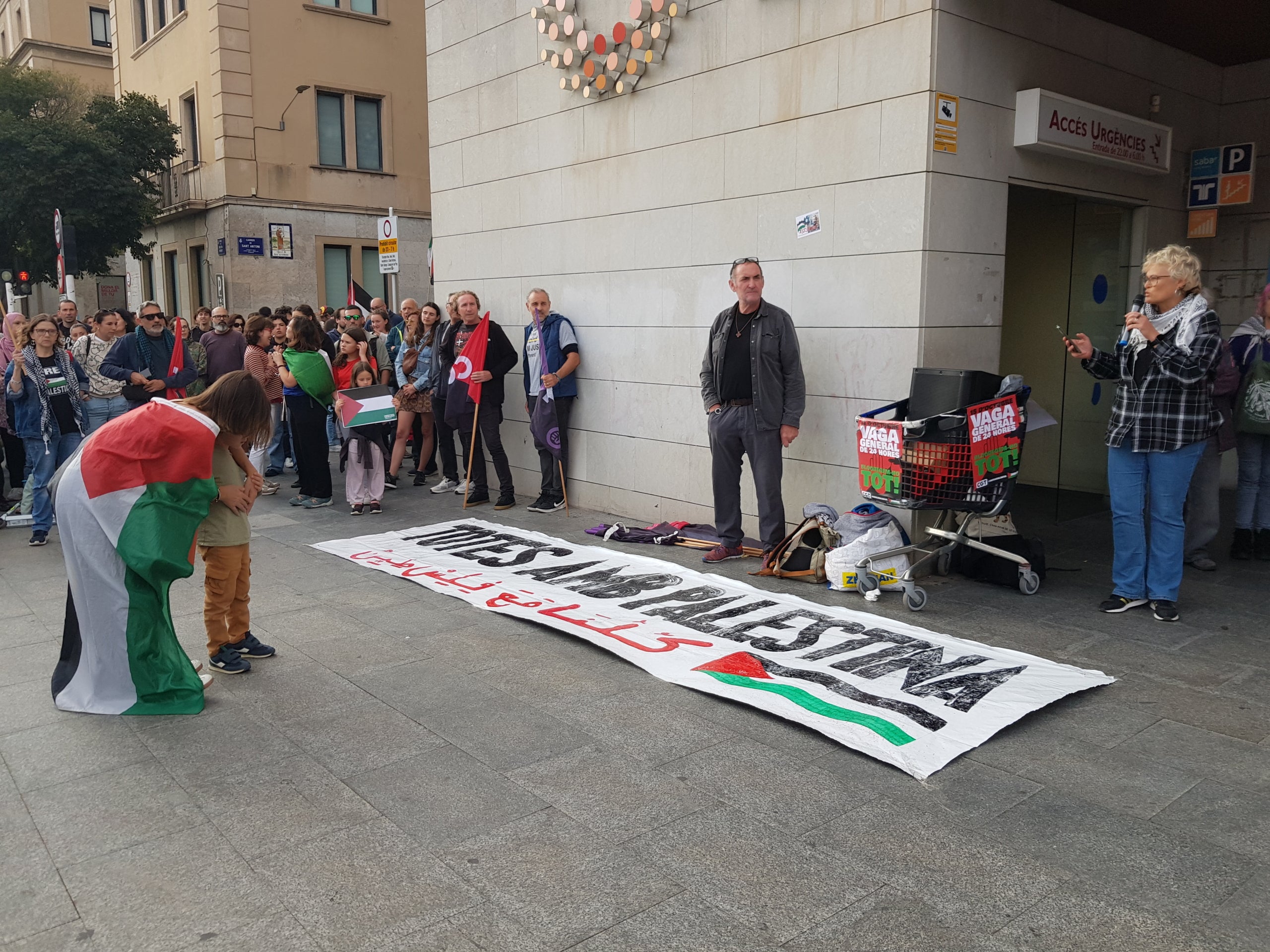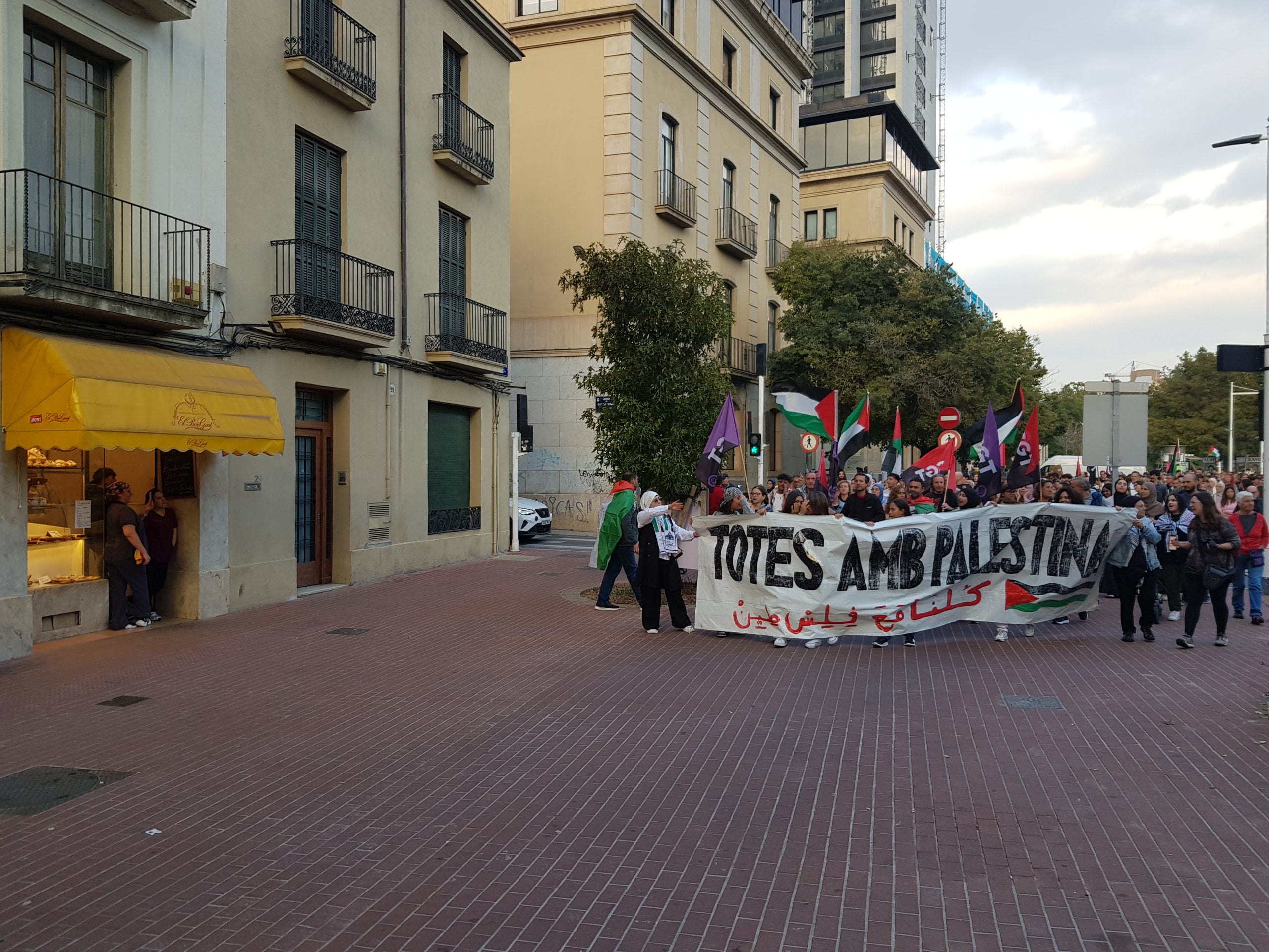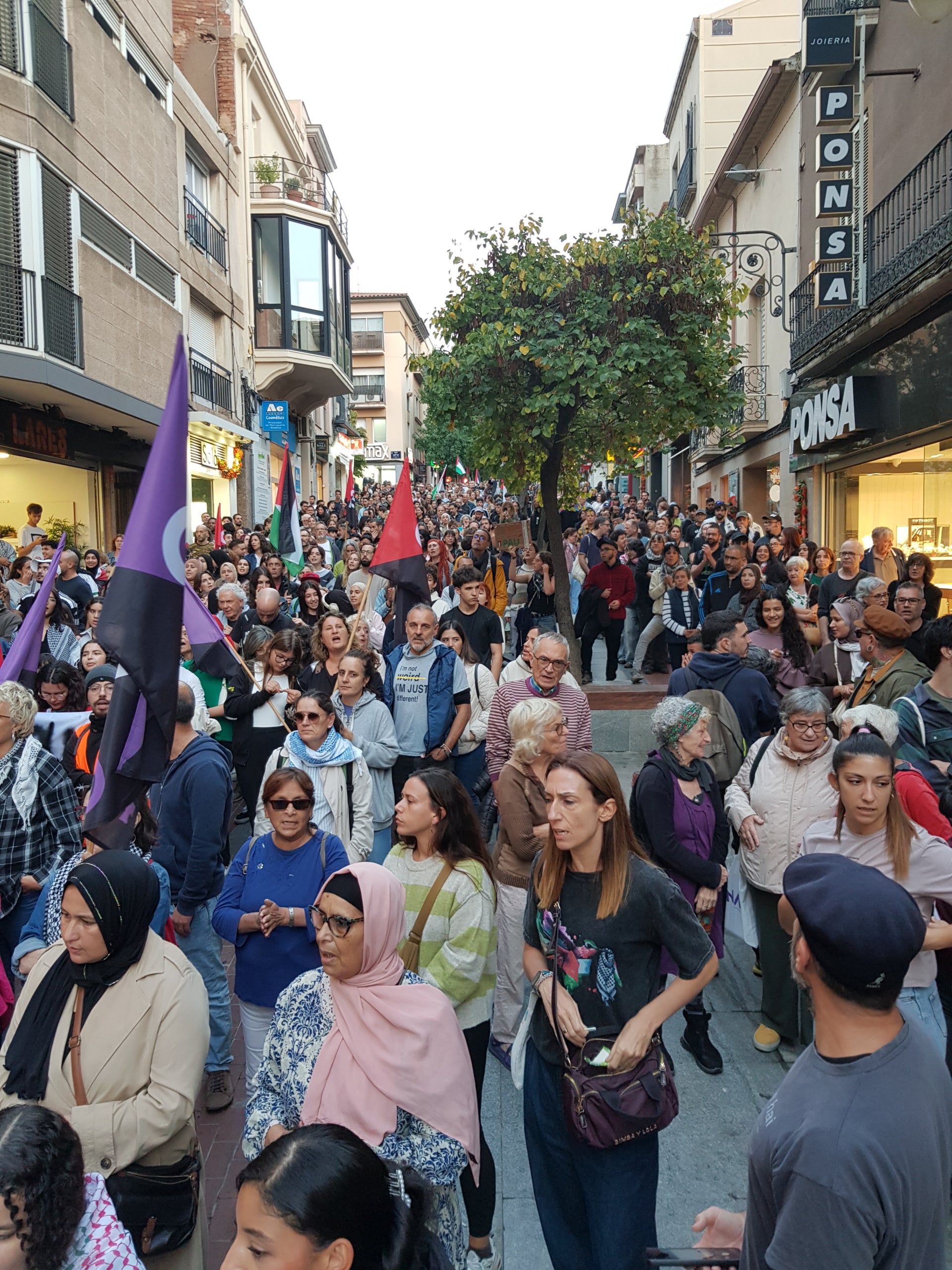 Terrassa s’ha adherit a la Vaga General per al poble palestí amb una manifestació que ha recorregut els carrers del Centre de la ciutat. La convocatòria, feta des Terrassa amb Palestina i sindicats com COS i CGT s’ha iniciat des de davant de MútuaTerrassa, on s’ha volgut denunciar amb una performance i un manifest “la vulneració del dret internacional per part d’Israel” i al mateix temps “homenatjar el personal sanitari de Gaza” que ha estat salvant vides. La manifestació ha transcorregut amb càntics a favor d’una Palestina lliure i d’un boicot a Israel. Amb algunes aturades per llegir testimonis i manifest, i amb intents de tancar comerços que no han prosperat, la comitiva ha arribat fins al Raval, on s’ha fet l’acte de cloenda | Lluïsa Tarrida