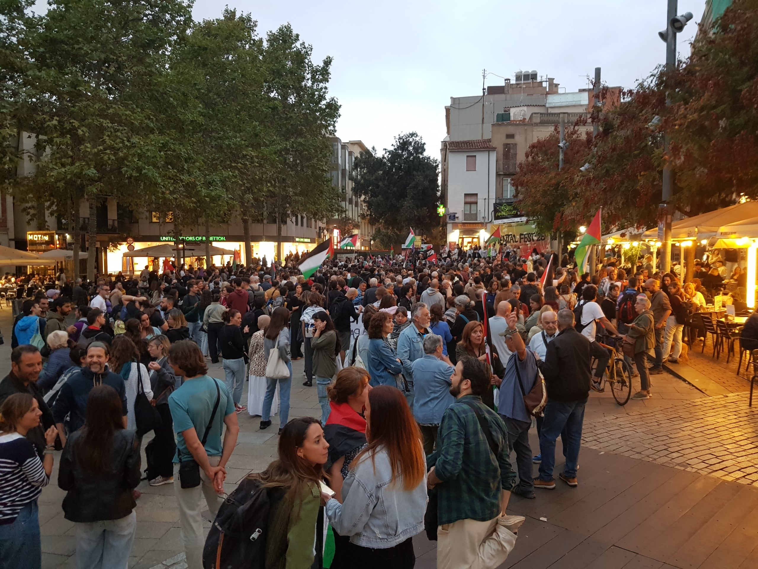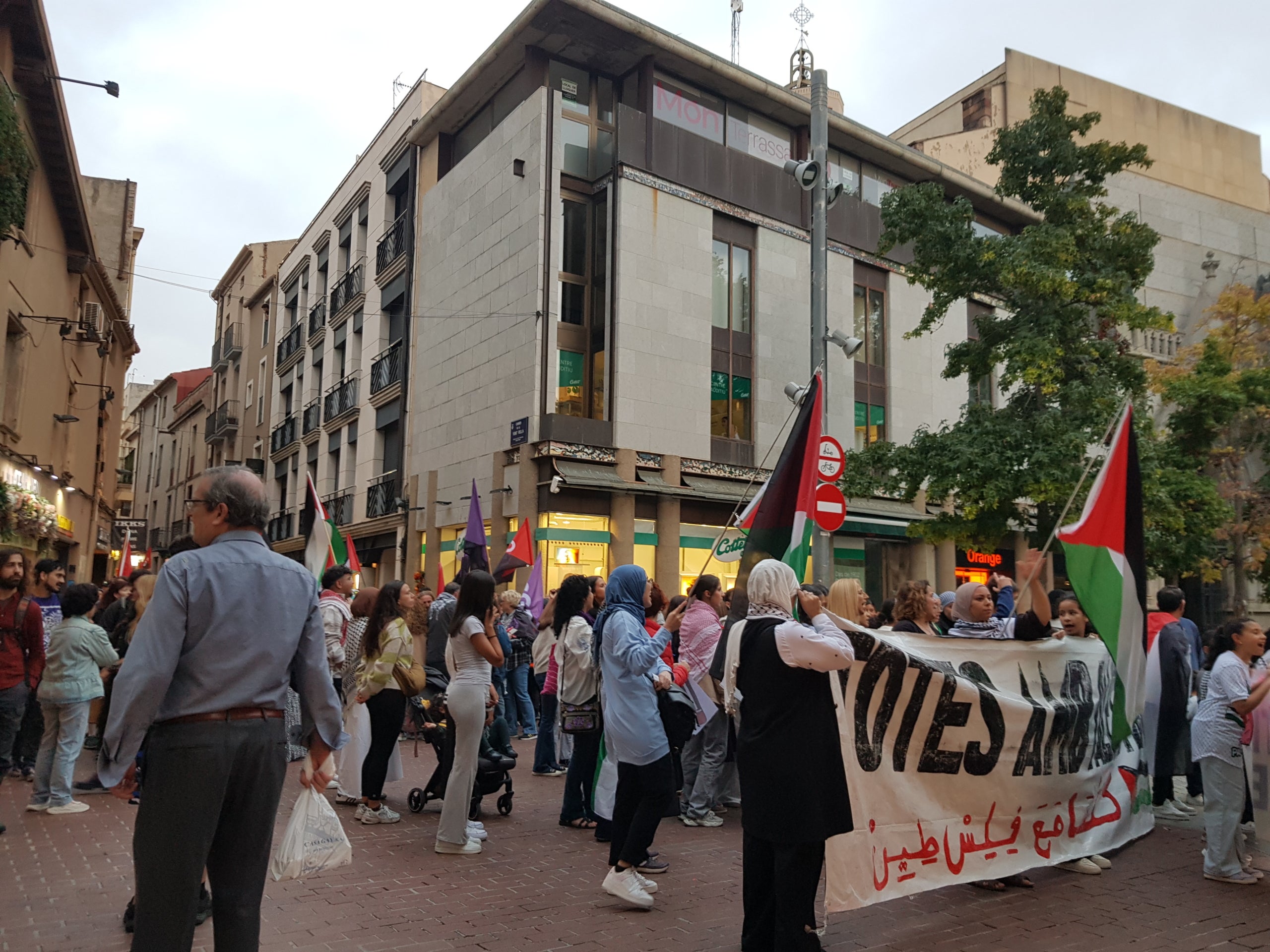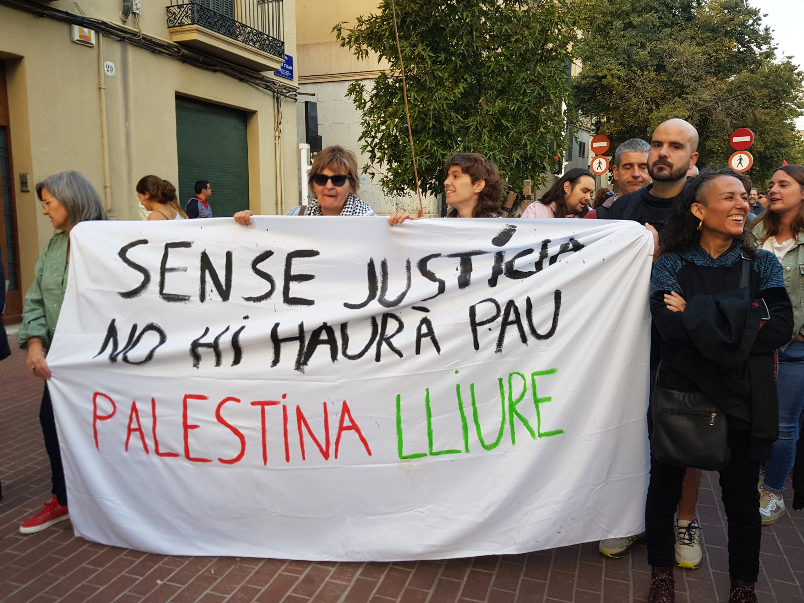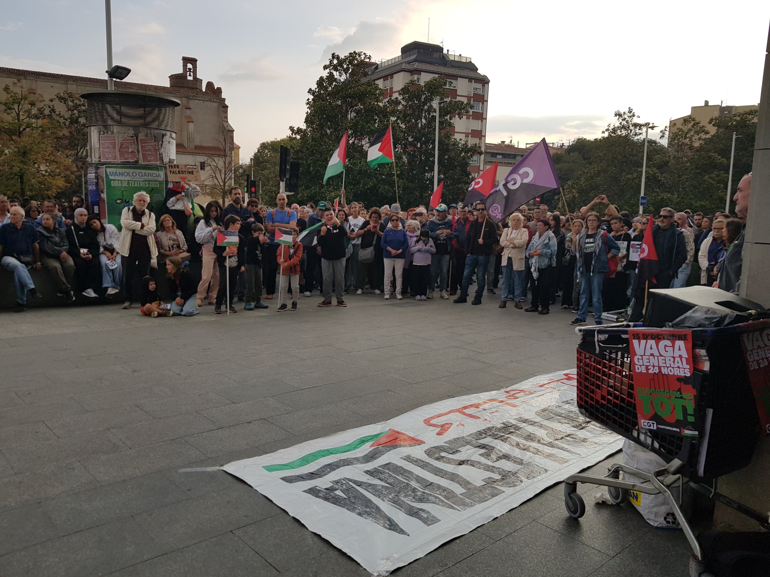 Terrassa s’ha adherit a la Vaga General per al poble palestí amb una manifestació que ha recorregut els carrers del Centre de la ciutat. La convocatòria, feta des Terrassa amb Palestina i sindicats com COS i CGT s’ha iniciat des de davant de MútuaTerrassa, on s’ha volgut denunciar amb una performance i un manifest “la vulneració del dret internacional per part d’Israel” i al mateix temps “homenatjar el personal sanitari de Gaza” que ha estat salvant vides. La manifestació ha transcorregut amb càntics a favor d’una Palestina lliure i d’un boicot a Israel. Amb algunes aturades per llegir testimonis i manifest, i amb intents de tancar comerços que no han prosperat, la comitiva ha arribat fins al Raval, on s’ha fet l’acte de cloenda | Lluïsa Tarrida