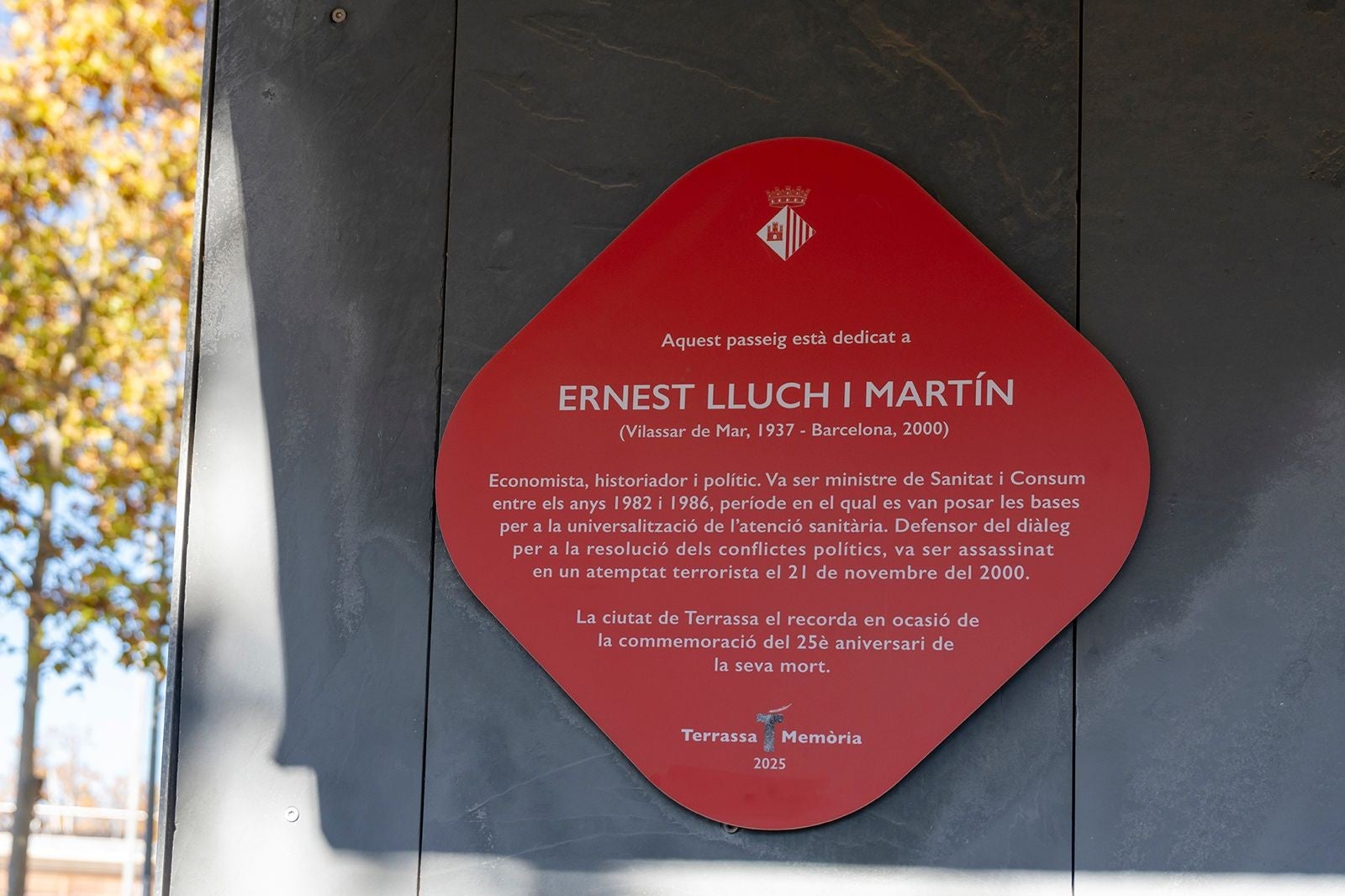 Aquest dissabte ha tingut lloc l’acte commemoratiu del 25è aniversari de l’assassinat en atemptat terrorista de l’economista i exministre de Sanitat i Consum Ernest Lluch. L’homenatge, organitzat per l’Associació Veïnal del Barri Universitari - Cementiri Vell amb el suport de l’Ajuntament de Terrassa, ha començat al passeig d’Ernest Lluch, on s’han fet els parlaments i s’ha col·locat una placa commemorativa de Memòria Democràtica, per mantenir viu el seu llegat. Posteriorment, la comitiva s'ha traslladat al parc de Vallparadís, on s'ha fet una ofrena floral i un minut de silenci davant el monument en record de les víctimes del terrorisme | Cedida