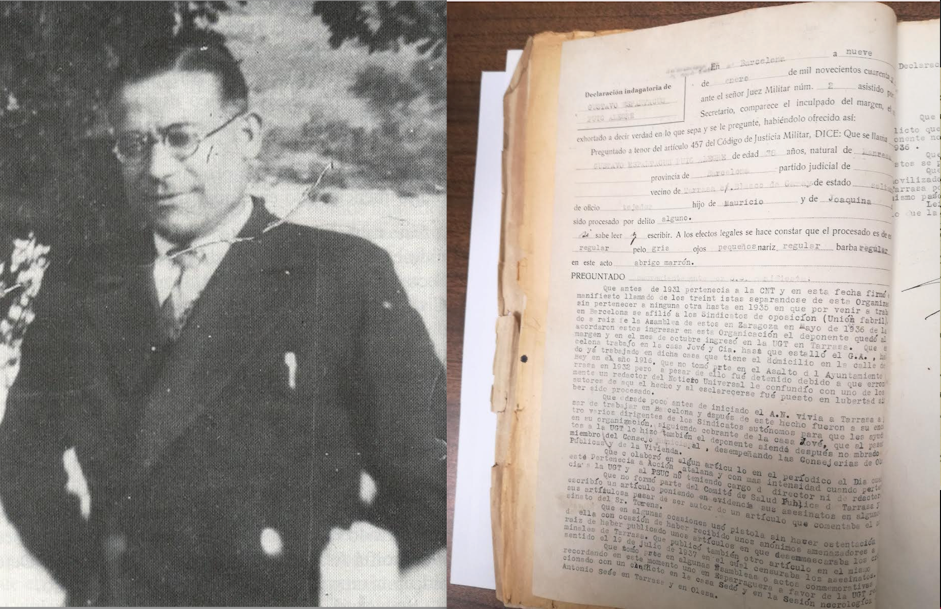 Instrucció: Jutge Instructor. Capità Hº de Cos Jurídic, José Garcia Aranda. Capità d’Infanteria, Francisco Cabaña Ruiz; Comandant d’Infanteria, Ricardo Antolin Gutiérrez. Secretari. Soldat, Angel Ballbé Sallent. Jutjat Militar de Terrassa núm. 2. Inici de les actuacions (29/07/1940).