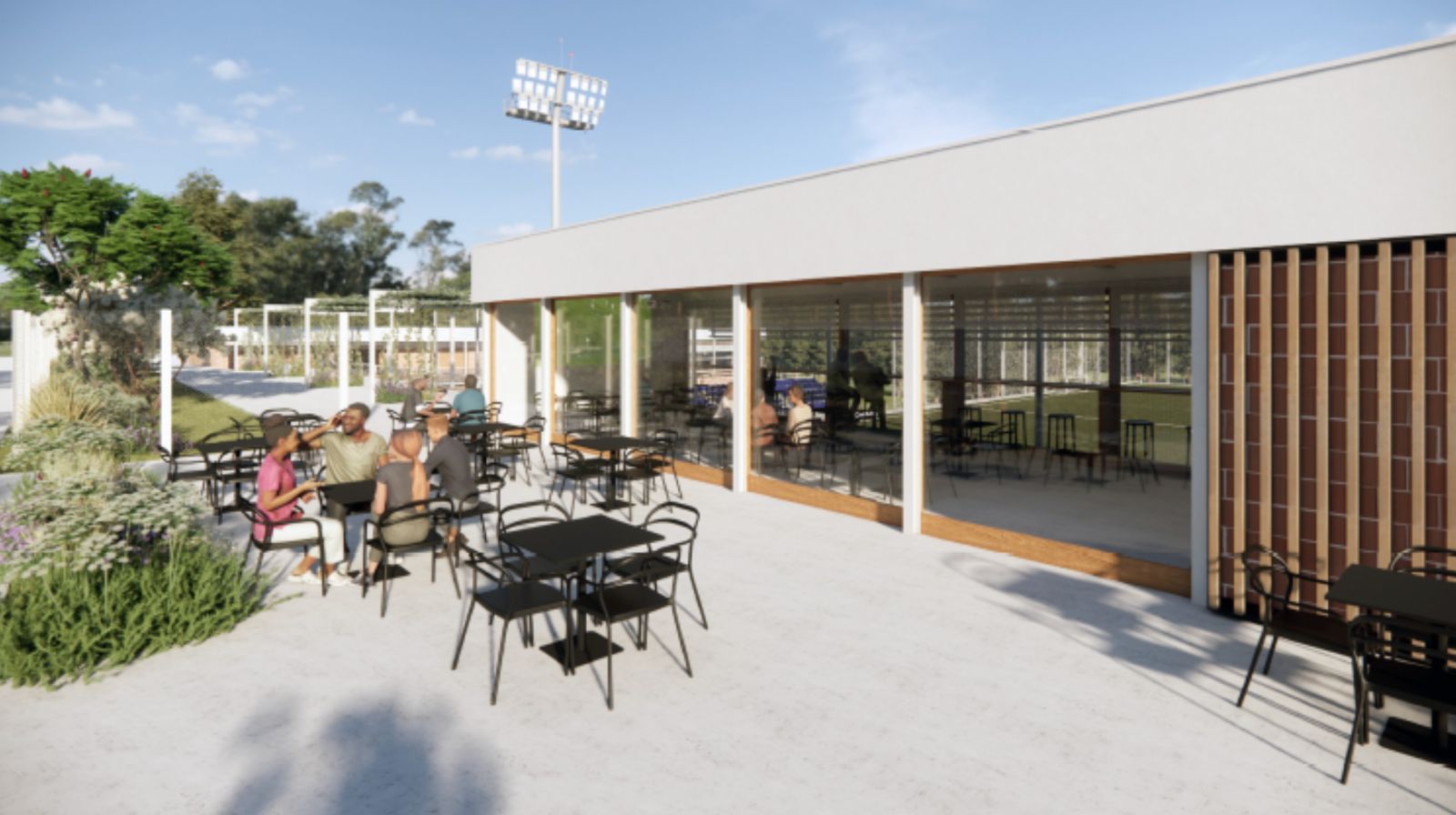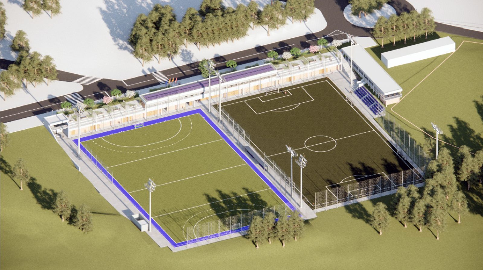 La zona esportiva situada a l’entrada est del municipi, des de la carretera de Sabadell, disposarà un cop finalitzada l’ampliació de deu nous vestidors (sis per al futbol i quatre per a l’hoquei), a més dels àrbitres i altres serveis. Aquesta part per als esportistes estarà semisoterrada al mateix nivell dels dos camps, mentre que la part superior de la grada estarà a cota de l’avinguda del Mas Sot, amb la cafeteria que oferirà vistes sobre la pràctica esportiva. L’edifici en conjunt tindrà 962 metres quadrats, amb 330 per a les graderies. Aquests estaran protegides de l’assolellament i el clima per pèrgoles lleugeres amb vegetació enfiladissa i l’accés serà únicament en horari d’obertura del ZEM, quan hi hagi partits i activitats.