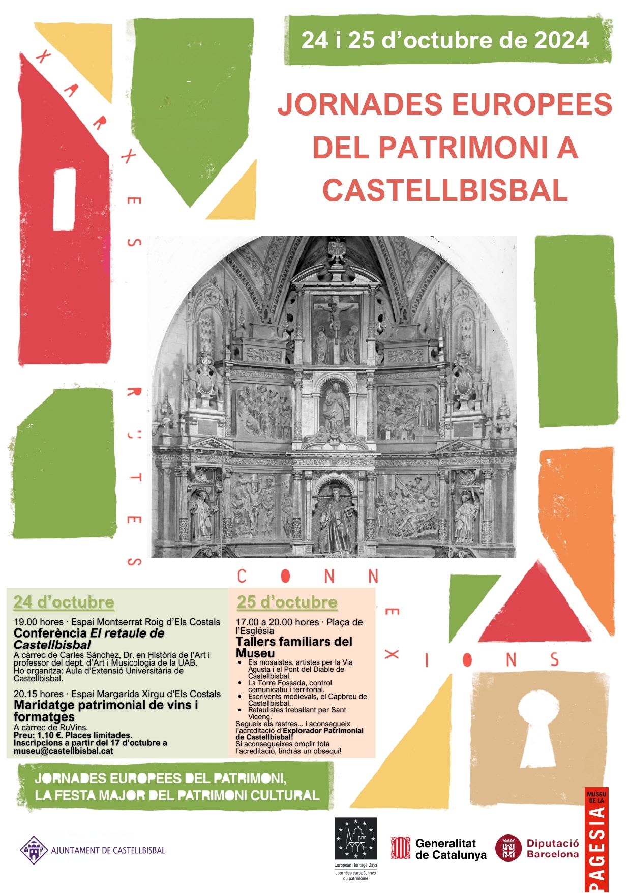 Les jornades iniciaran el dijous, 24 d’octubre, a les 19:00 hores a l’Espai Montserrat Roig d’Els Costals amb la conferència ‘El retaule de Castellbisbal’. Aquest acte anirà a càrrec de de Carles Sánchez, doctor en Història de l’Art i professor del departament d’Art i Musicologia de la UAB, i està organitzat per l’Aula d’Extensió Universitària. Posteriorment, a les 20:15 hores, a l’Espai Margarida Xirgu, es durà a terme un maridatge patrimonial de vins i formatges. En aquest cas, per participar a l’activitat, que té un preu simbòlic d’1,10 €, cal inscripció prèvia a museu@castellbisbal.cat.