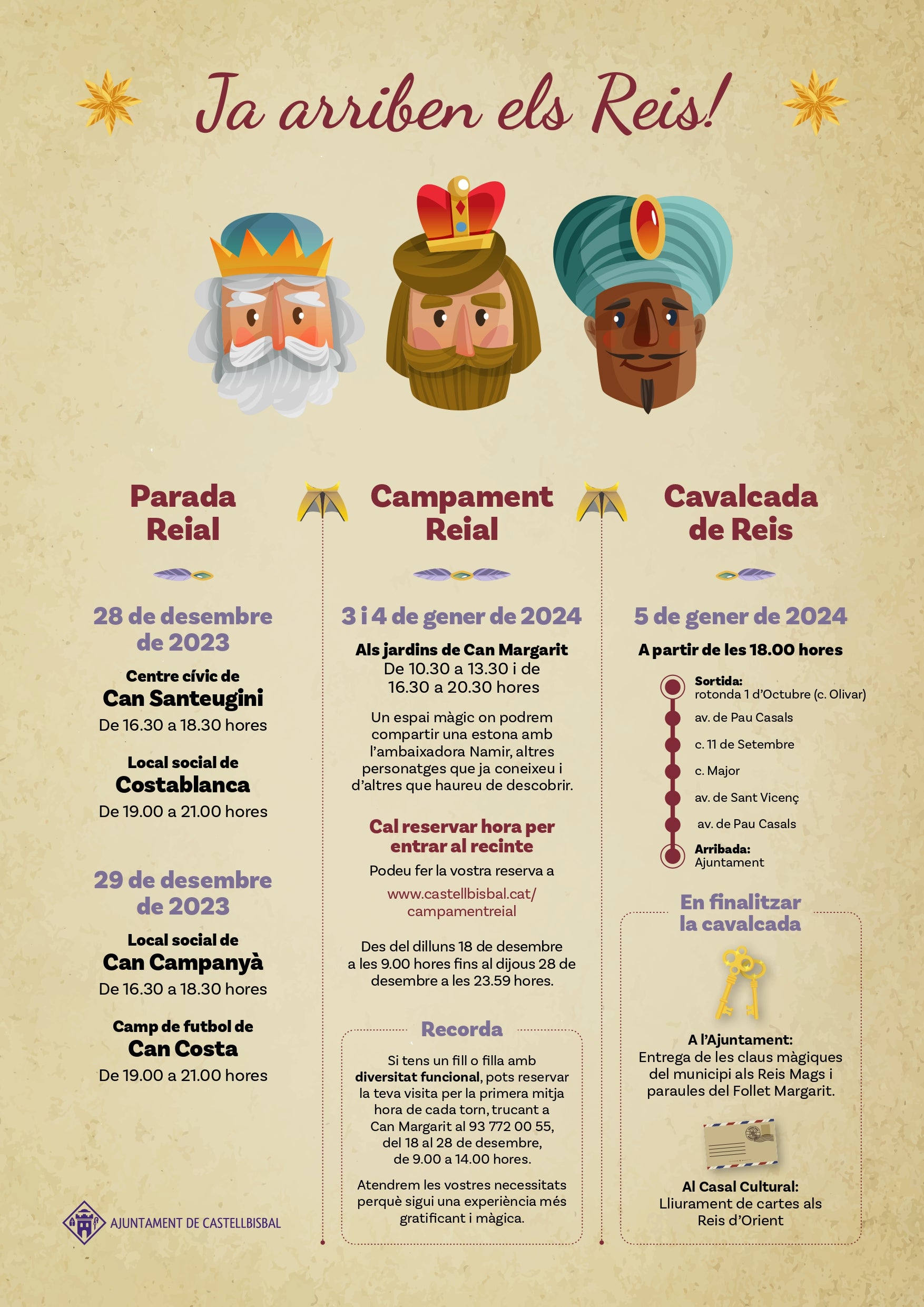 Enguany, els Reis Mags d’Orient faran quatre parades reials a Castellbisbal. La primera tindrà lloc el 28 de desembre al Centre Cívic de Can Santeugini de les 16:30 a les 18:30 hores. Aquell mateix dia, faran una segona aturada. Aquesta serà al Local Social de Costablanca de les 19:00 a les 21:00 hores.