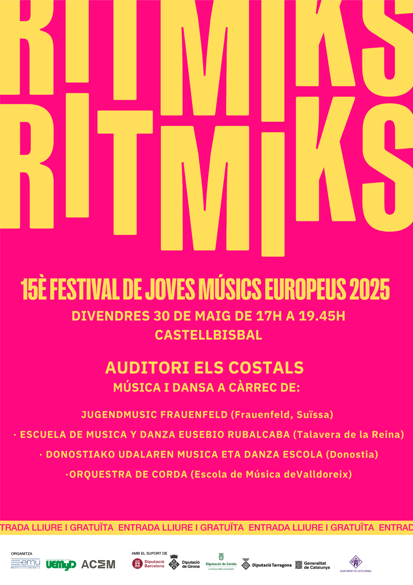 Castellbisbal és una de les 40 poblacions catalanes que han estat escollides enguany per acollir el Festival de Joves Músics Europeus Ritmiks, que aquest 2025 arriba a la seva 15a edició. L’escenari de les actuacions del festival serà l’auditori d’Els Costals i la Plaça de l’Església. La jornada tindrà lloc el pròxim 30 de maig i hi actuaran més de 150 joves músics arribats d’arreu de l’estat espanyol i Europa.