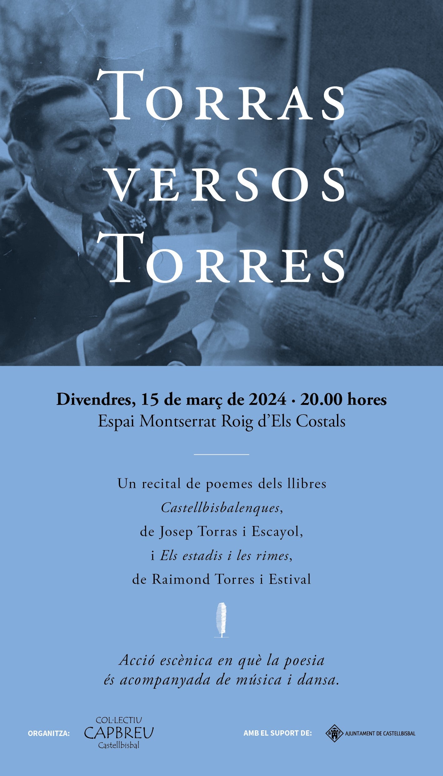 Castellbisbal té una nova cita per a totes aquelles persones amants de la poesia. El pròxim divendres, 15 de març, a les 20:00 hores arriba a l’Espai Montserrat Roig d’Els Costals l’espectacle ‘Torras versus Torres’. Es tracta d’un recital de poemes de dos autors coetanis que, malgrat haver viscut mitja vida a Castellbisbal, només hi van coincidir un breu període de temps. Es tracta de Josep Torras i Escayol i Raimond Torres i Estival.