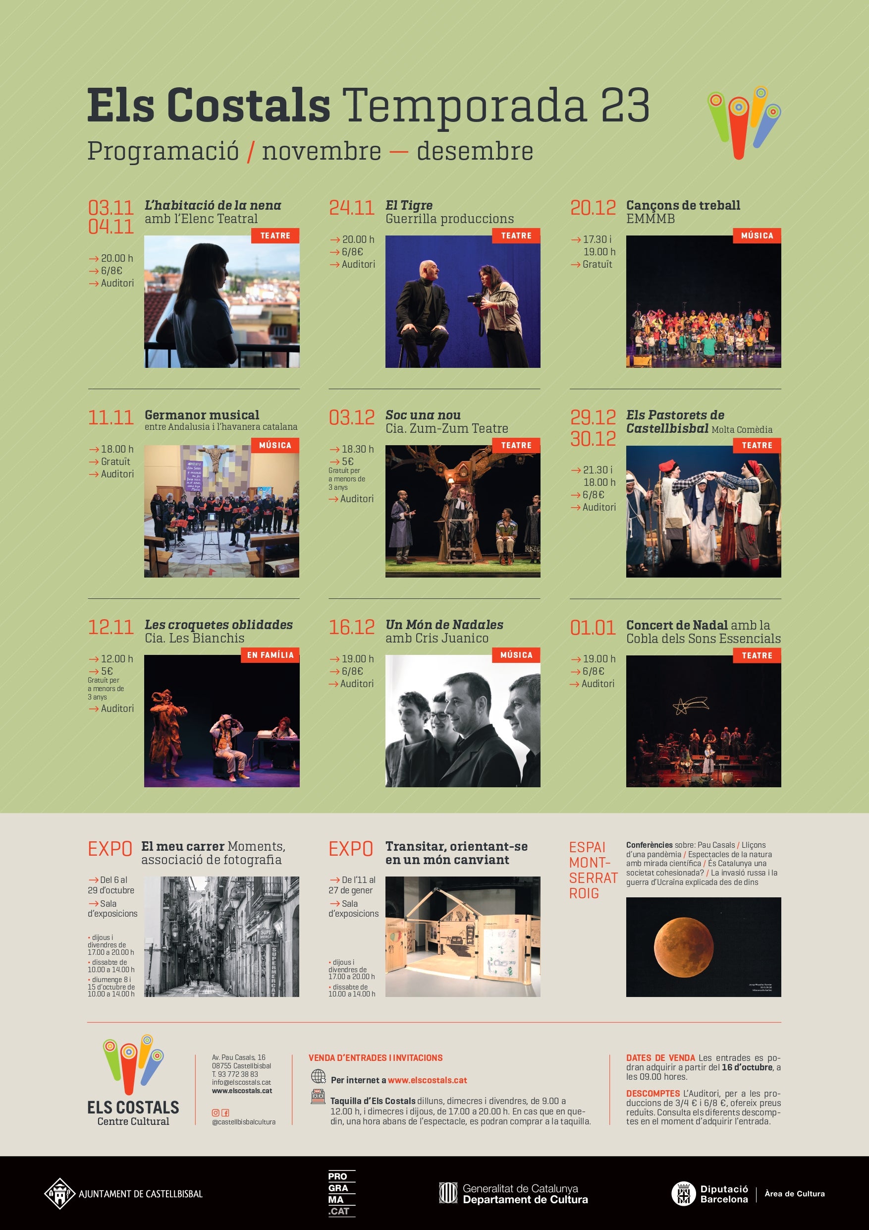 El Centre Cultural Els Costals ha fet pública la programació per als mesos de novembre i desembre. A partir de dilluns 16 d’octubre ja podeu comprar les entrades per als espectacles d’aquesta nova temporada des de la web o a la taquilla d’Els Costals.