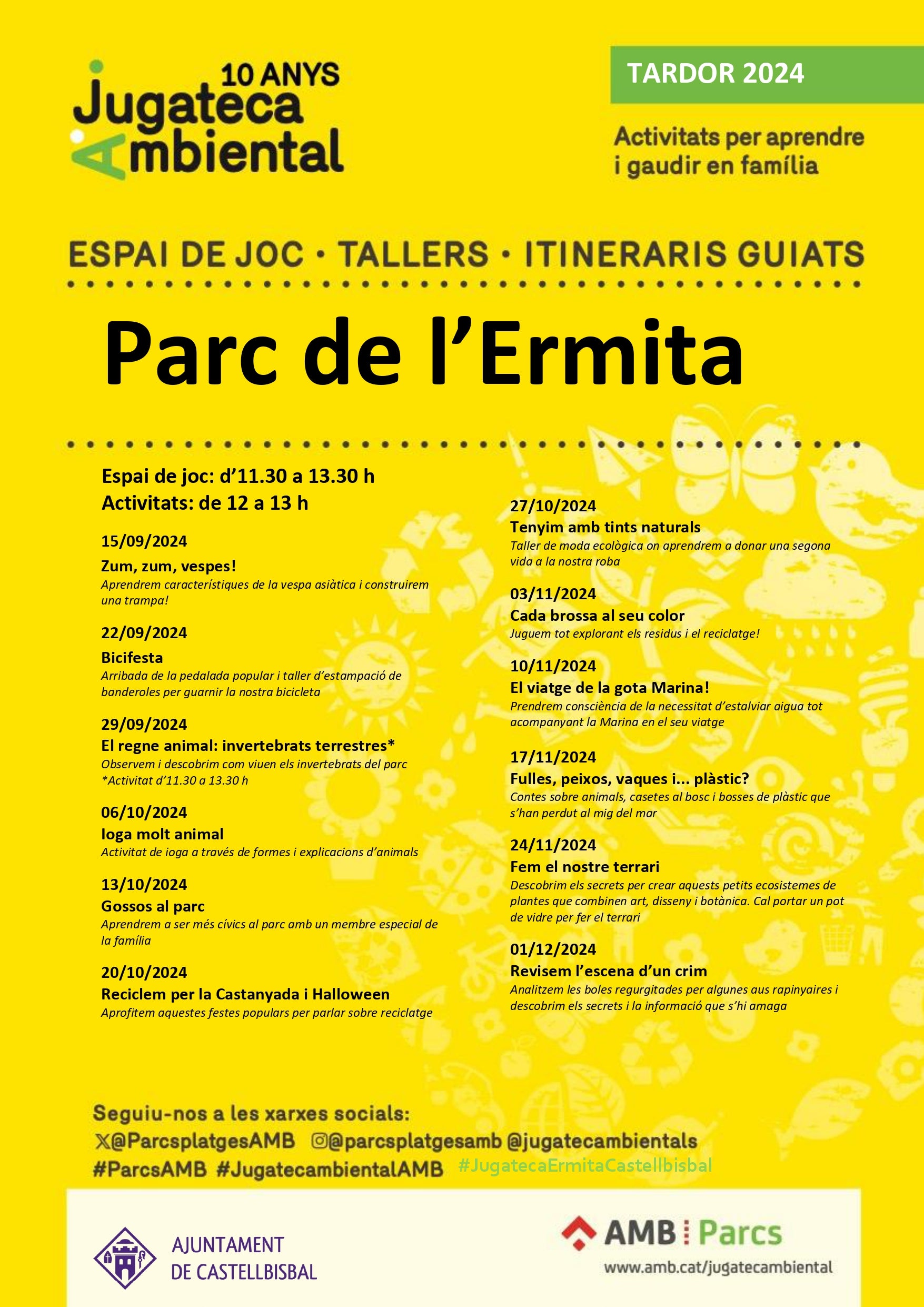 D’aquesta manera, cada diumenge, fins a l’1 de desembre, el parc de l’Ermita comptarà amb un espai de joc d’11:30 a 13:30 hores i amb una activitat, de 12:00 a 13:00 hores. Totes les propostes són gratuïtes i no requereixen d’inscripció prèvia per participar-hi. La primera activitat de la nova programació de tardor de la Jugatecambiental es va celebrar el passat diumenge, 15 de setembre, i va constar d’un taller per descobrir la vespa asiàtica i aprendre a construir trampes per ajudar a controlar la seva població. El diumenge següent, 22 de setembre, es va organitzar la Bicifesta, una pedalada popular pel centre de la població que estava emmarcada en celebració de la Setmana Europea de la Mobilitat.