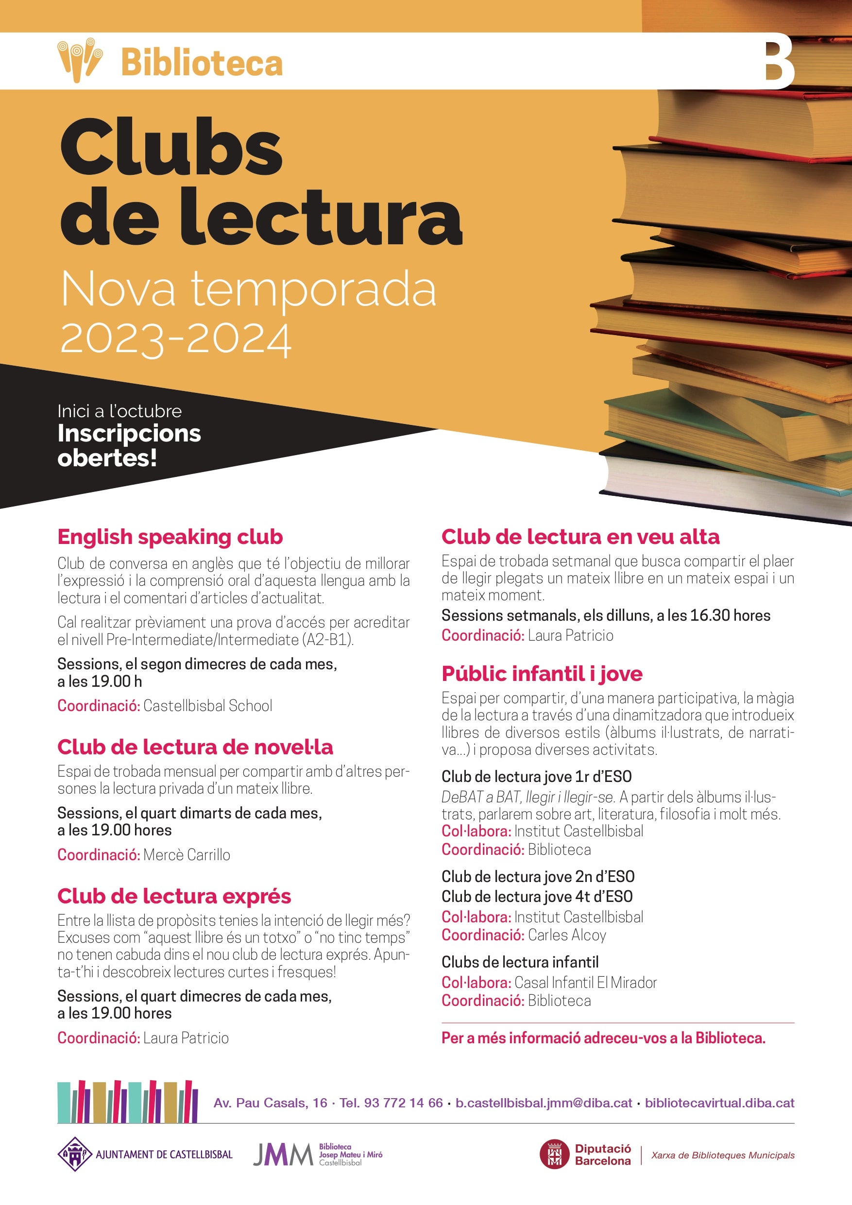 - Públic infantil i jove: Espai per compartir, de manera participativa, la lectura a través d’una dinamitzadora que introdueix llibres de diversos estils i gèneres, a més de la realització de diverses activitats. Aquests clubs de lectura comptaran amb diverses sessions orientades cap a alumnes de 1r, 2n i 4t de l’ESO. Per a més informació adreceu-vos a la Biblioteca o envieu un correu a b.castellbisbal.jmm@diba.cat.