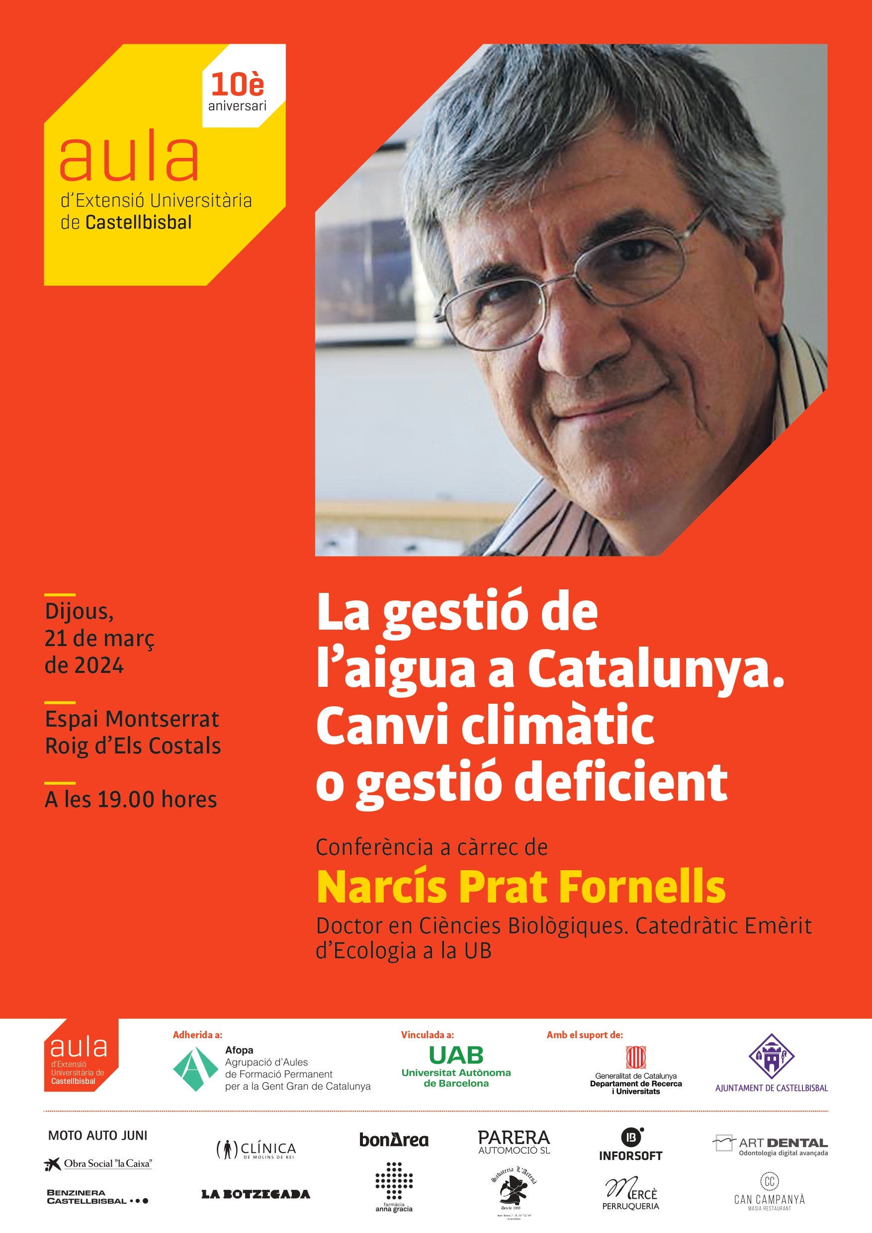 Per a respondre totes aquestes preguntes, aquest dijous, 21 de març, l’Espai Montserrat Roig acollirà la conferència ‘La gestió de l’aigua a Catalunya. Canvi climàtic o gestió deficient’. Aquesta xerrada de Narcís Prat Fornells, doctor en Ciències Biològiques i catedràtic emèrit d’Ecologia a la UB, intentarà donar resposta a totes aquestes preguntes i analitzarà la situació d’escassetat al municipi. Per a aconseguir-ho, el doctor de la UB ho farà mitjançant l’anàlisi del rebut de l’aigua de Castellbisbal.