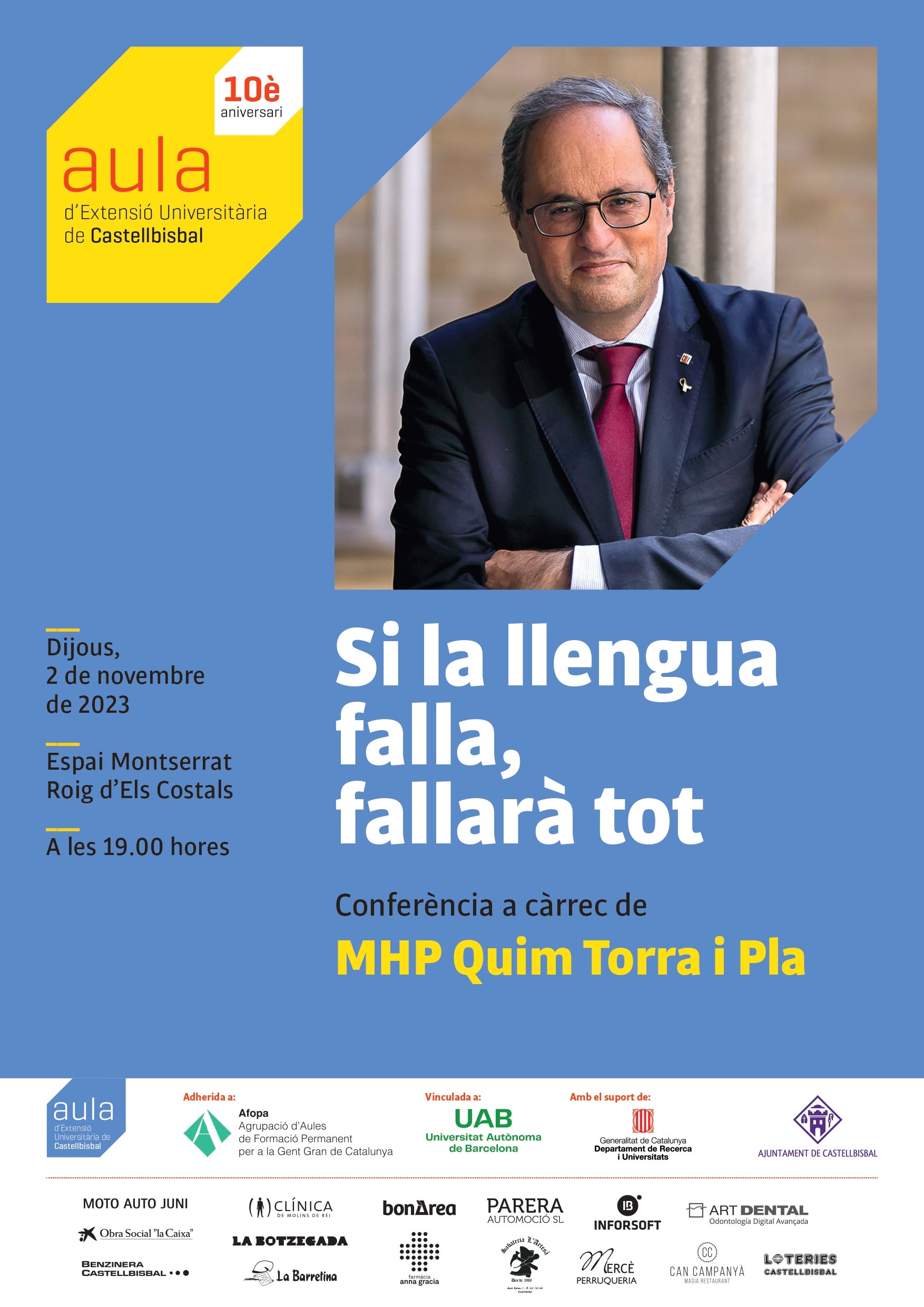 L’Expresident de la Generalitat Quim Torra oferirà el pròxim dijous, 2 de novembre, a les 19:00 hores la conferència “Si la llengua falla, fallarà tot” a l’Espai Montserrat Roig d’Els Costals . La frase que dona títol a la xerrada és de Pompeu Fabra i gira al voltant de la idea que “la nació catalana, el poble català, la identitat dels catalans té com a eix central i com a columna vertebral la llengua”.