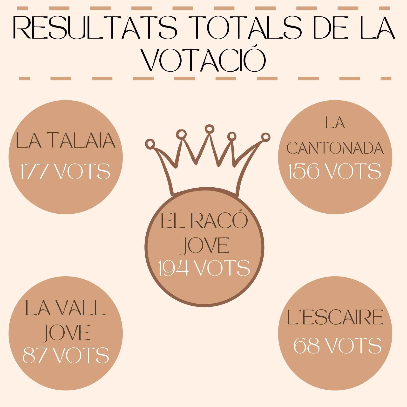 En total, s’han registrat 701 vots. Les opcions escollides van ser L’Escaire (68 vots), La Vall Jove (87 vots), La Cantonada (156 vots), La Talaia (177 vots) i El Racó Jove, que amb el 28 % dels vots (194) ha estat l’opció guanyadora.